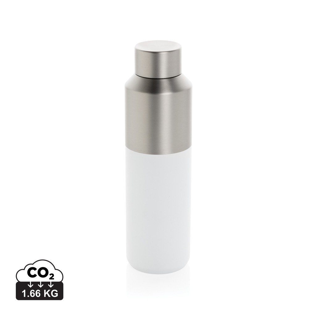 Tato 600ml láhev na vodu má jedinečný dvoubarevný stylový design. Dvoustěnná vakuová láhev z recyklované nerezové oceli udrží nápoje chlazené až 15 hodin nebo teplé až 5 hodin. Láhev na vodu se vejde do většiny standardních držáků nápojů v autě. Vyrobeno z certifikovaných recyklovaných materiálů podle normy RCS (Recycled Claim Standard), která zajišťuje plně certifikovaný dodavatelský řetězec recyklovaných materiálů. Recyklovaný obsah v celkové hmotnosti výrobku: 95 %. Neobsahuje BPA. Včetně dárkového balení z kraftového papíru s certifikací FSC®.