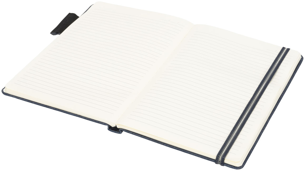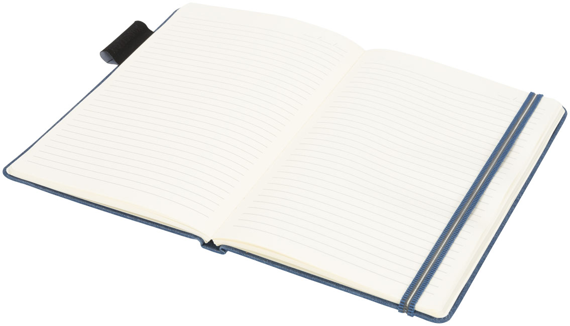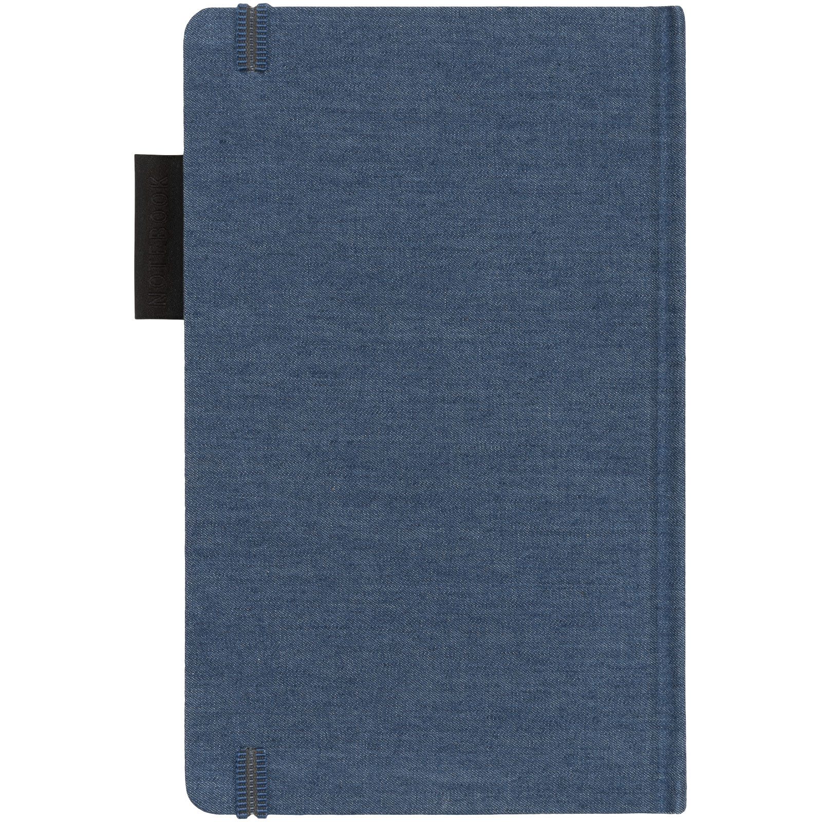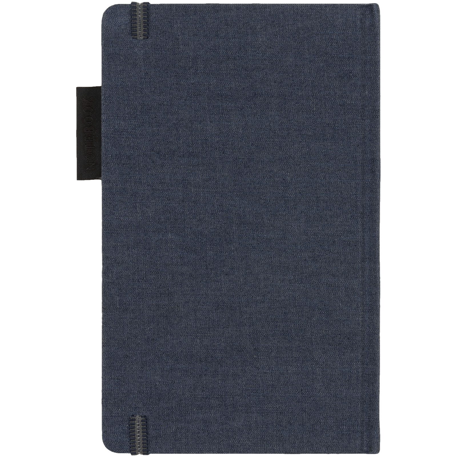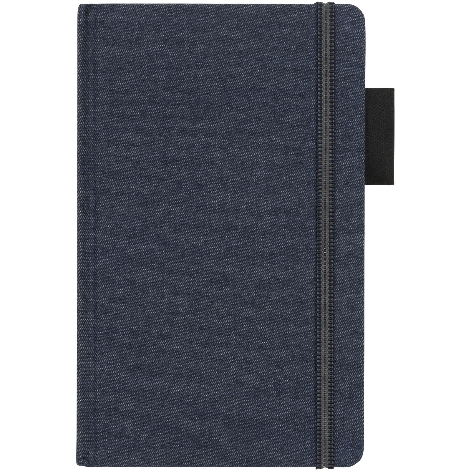 Zápisník v látkovém přebalu z džínoviny, velikost A5, s 80 listy krémového linkovaného papíru, s elastickým uzávěrem speciálního designu, stužkou k založení stránky a poutkem na pero. Baleno v dárkové kazetě. Fabric.