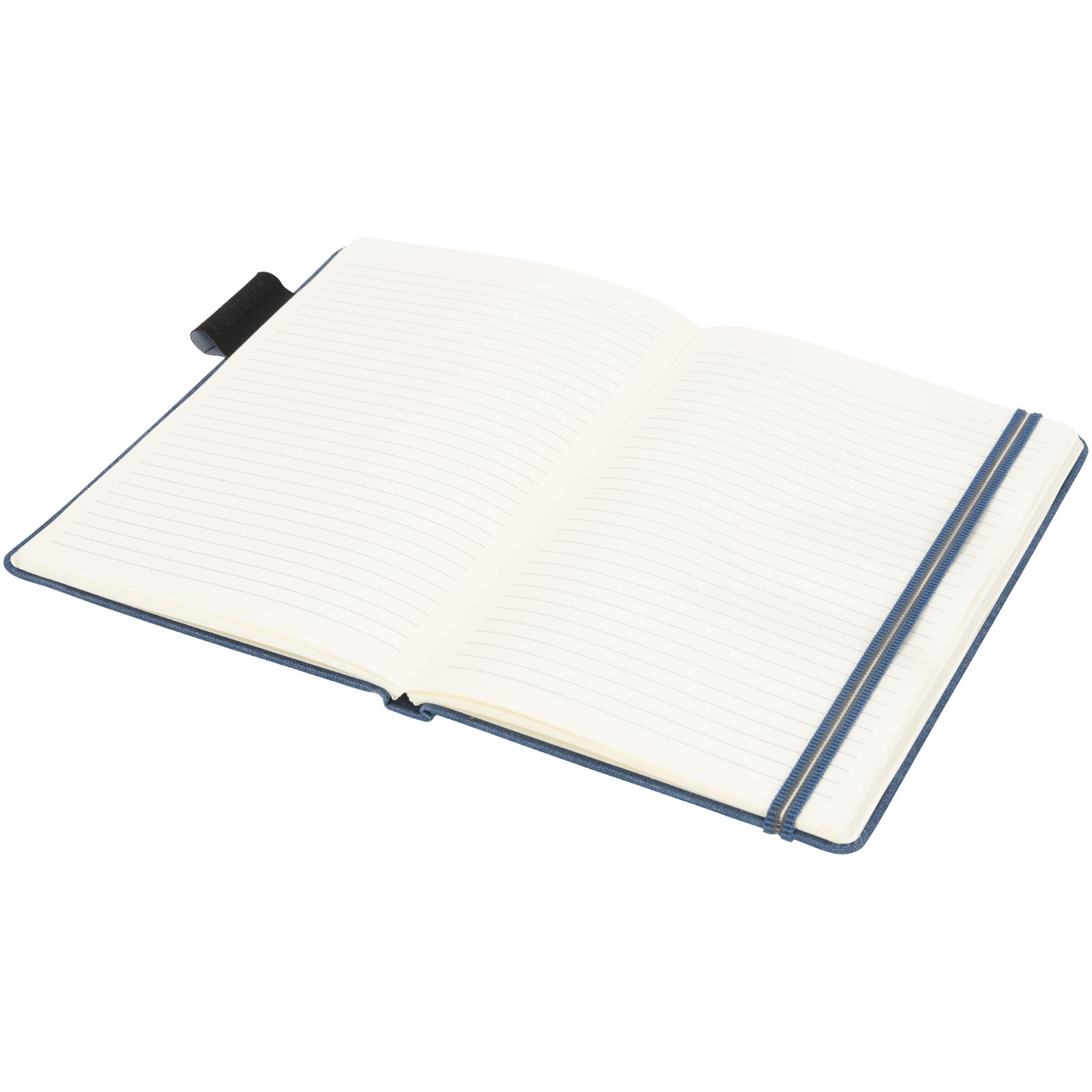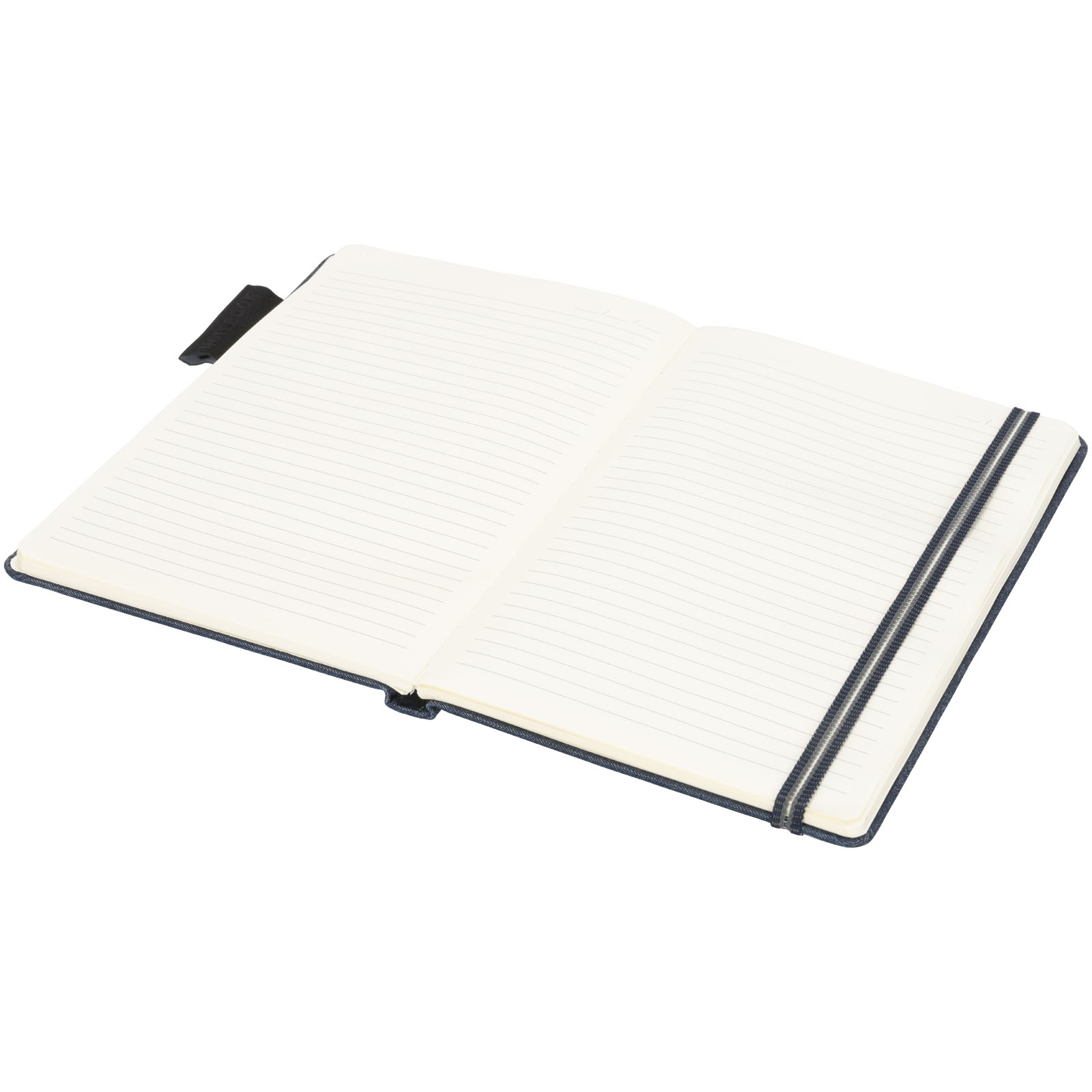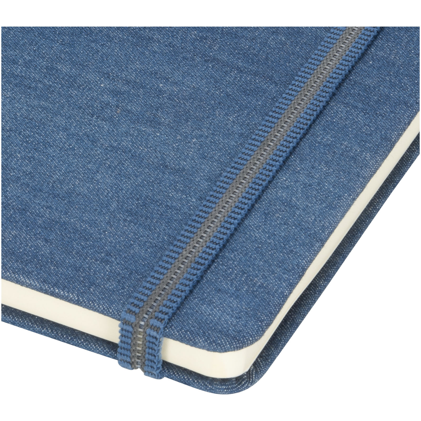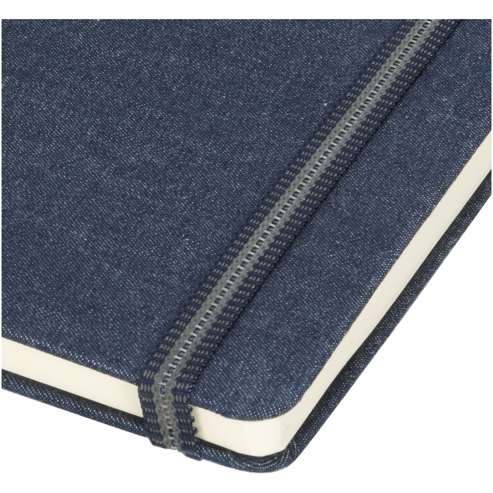 Zápisník v látkovém přebalu z džínoviny, velikost A5, s 80 listy krémového linkovaného papíru, s elastickým uzávěrem speciálního designu, stužkou k založení stránky a poutkem na pero. Baleno v dárkové kazetě. Fabric.