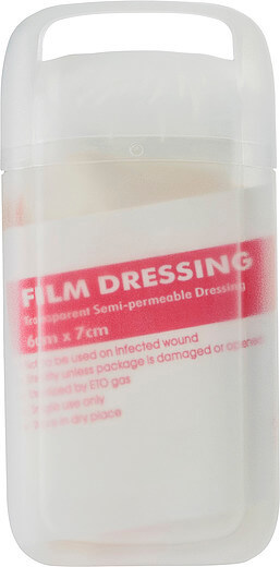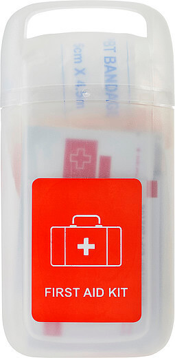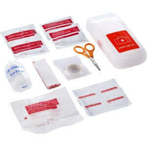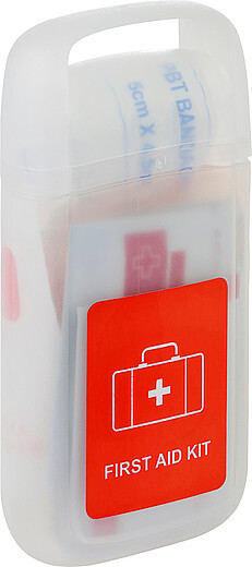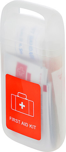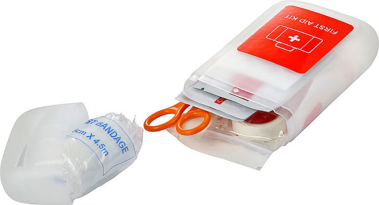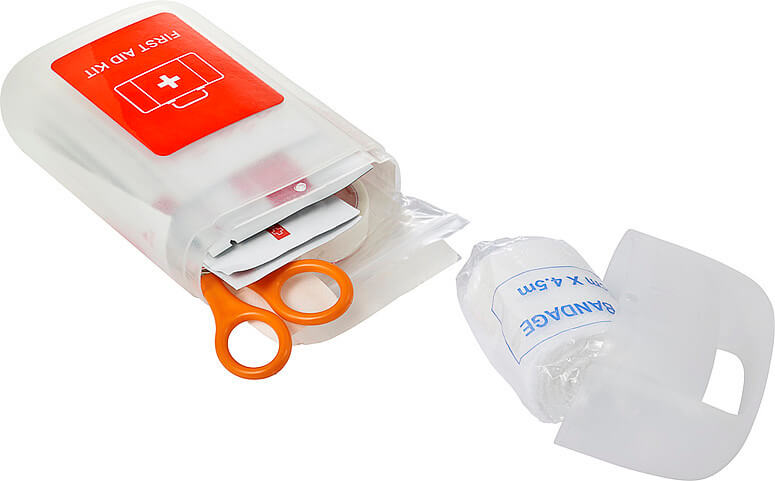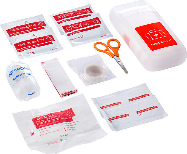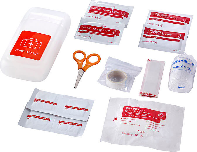 Lékárnička v průhledném plastovém obalu z PP. Sada obsahuje: obvaz, netkanou houbu, pět sterilních obvazů, obvaz PBT, čtyři alkoholem napuštěné tampóny, sadu vlhkých ručníků, antiseptický ubrousek, jednu pásku a jedny nůžky.