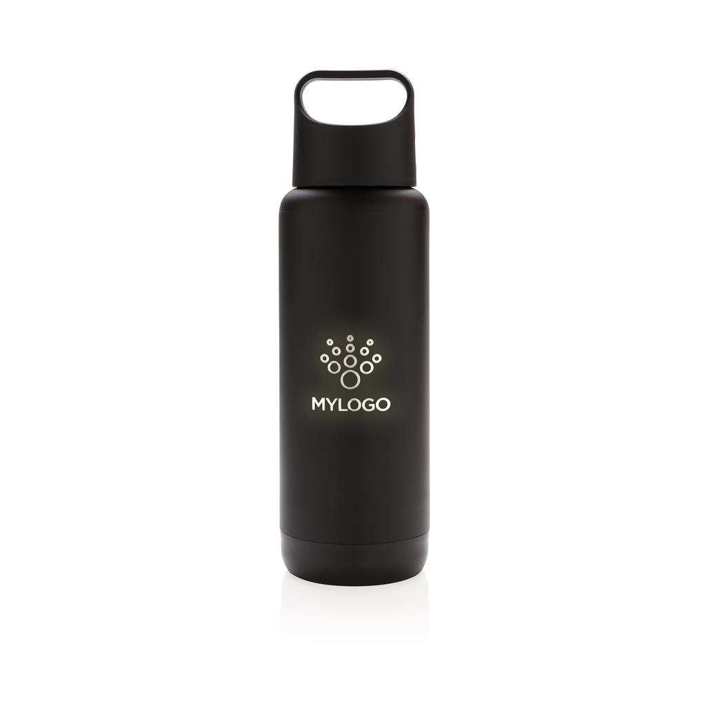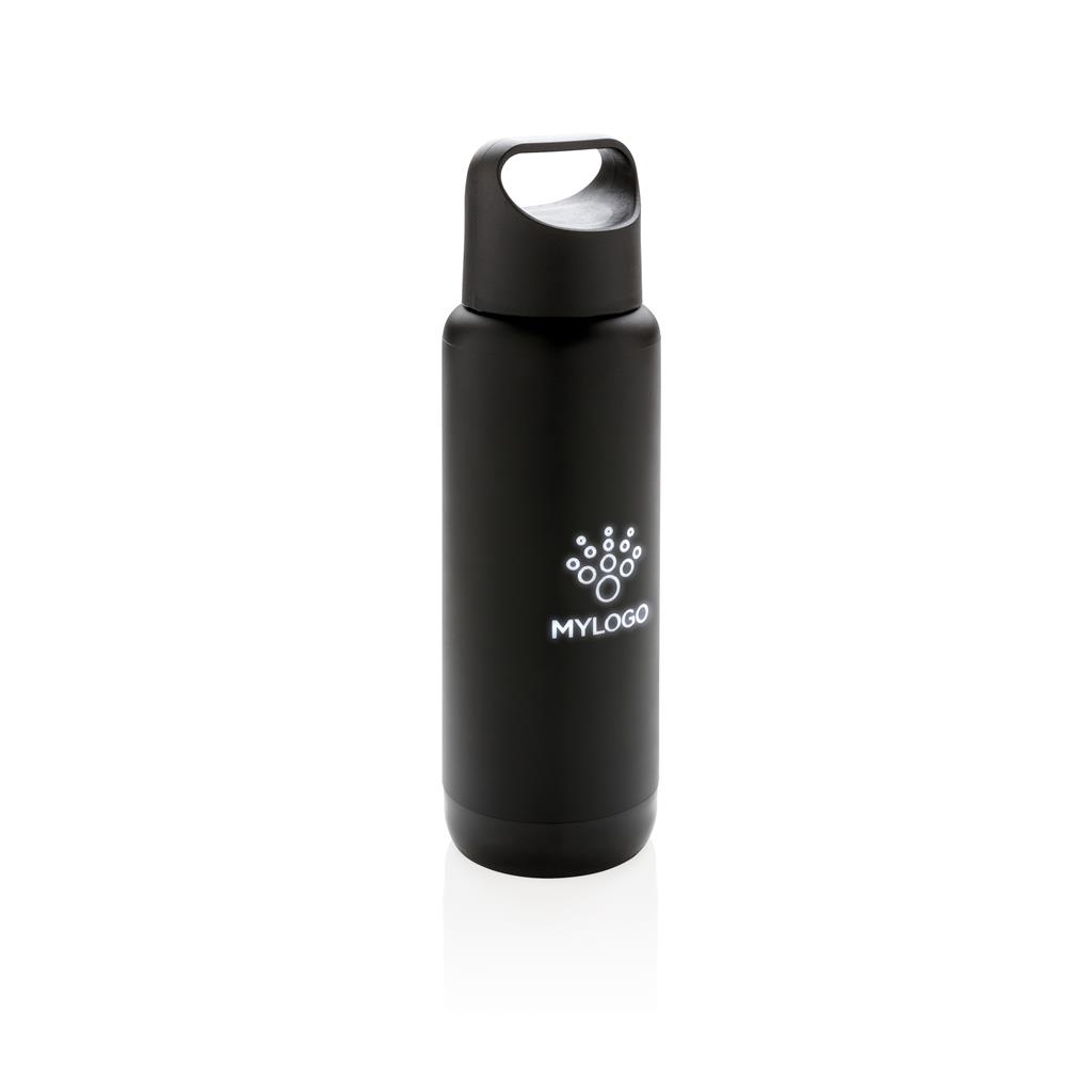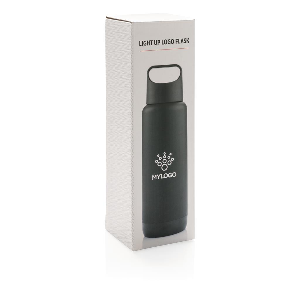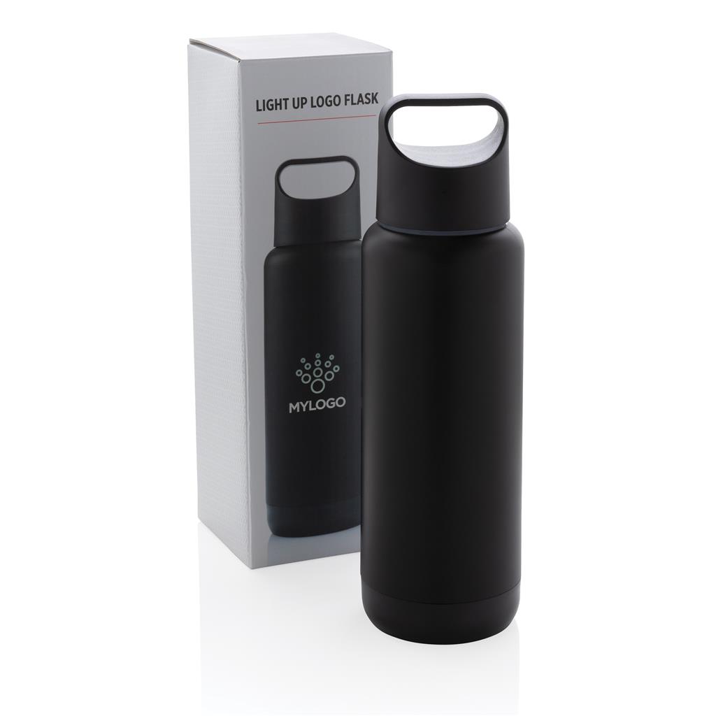 Termo láhev s dvojitou stěnou, vyrobená z nerezavějící oceli (uvnitř 304 SS, vně ABS plast). Na vyhrazeném místě lze brandovat originálním gravírem, jehož vzor se po uchopení hrnku rozsvítí a vaše logo tak stylově zvýrazní. Rozsvěcování lze vypnout tlačítkem. Obsahuje 2 CR2032 baterie. Objem 500 ml. 2 baterií typu Li-ion súčasťou balenia. PMS color 1: Black