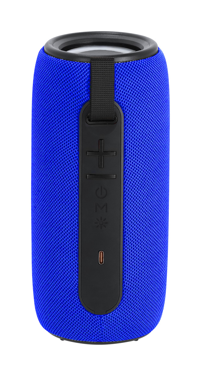 Bluetooth reproduktor s polyesterovým potahem, vícebarevným LED světlem (s 5 světelnými režimy) a popruhem na nošení. Se 2 reproduktory, funkcí handsfree volání a vestavěnou dobíjecí baterií (1200 mAh). Včetně USB nabíjecího kabelu.