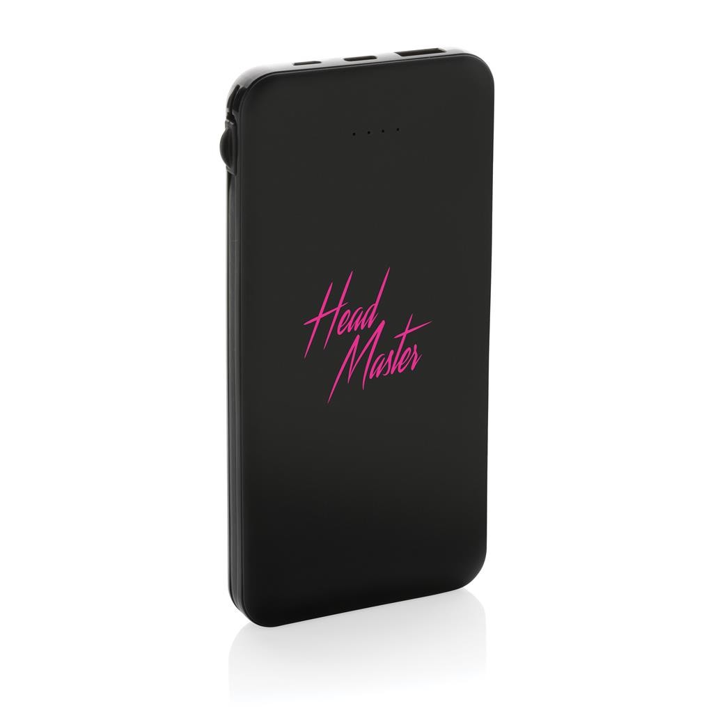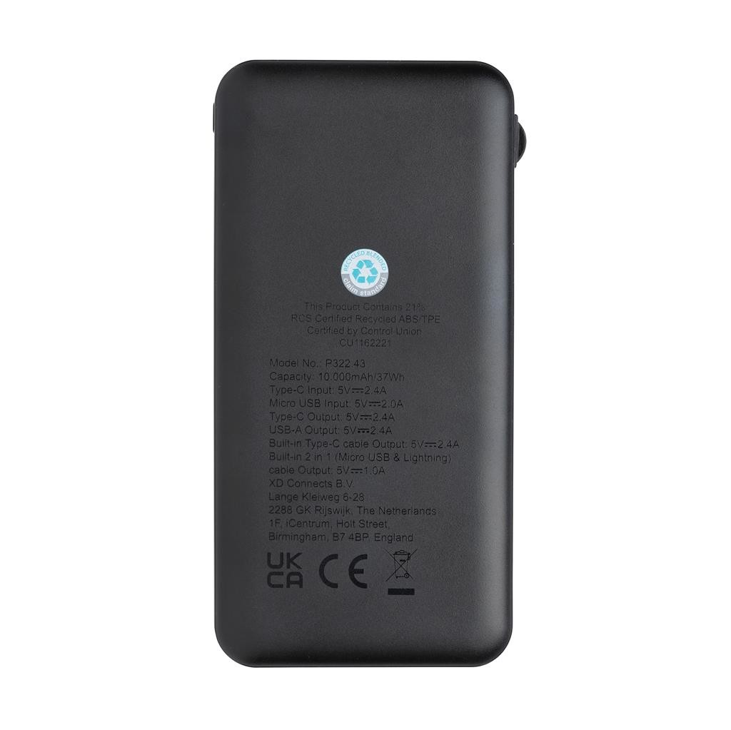 Plochá powerbanka s kapacitou 10 000 mAh s integrovanými nabíjecími kabely, kde je pouzdro vyrobené z certifikovaného recyklovaného plastu ABS s certifikátem RCS (Recycled Claim Standard), kabely jsou vyrobené z certifikovaného recyklovaného TPE. RCS (Recycled Claim Standard) je standardem pro overovanie recyklovaného obsahu výrobku v celom dodávateľskom reťazci. Celkový recyklovaný obsah: 21 % na základě celkové hmotnosti výrobku. Powerbanka obsahuje odolnou lítium-polymérovou batériu třídy A s kapacitou 10 000 mAh. Indikátory predstavujú potrebnú úroveň energie, vždy viete, kedy je potrebné. Vstup Micro USB 5V/2A; vstup Typ-C 5V/2,4A; výstup USB 5V/2A; výstup Type-C: 5V/2,4A, výstup kabel iOS: 5V/1A. a príslušenstvo neobsahujú PVC. Kábel typu C totální PVC a je vyrobený z recyklovaného materiálu TPE. 1 Li-poly batéria je součástí dodávky.