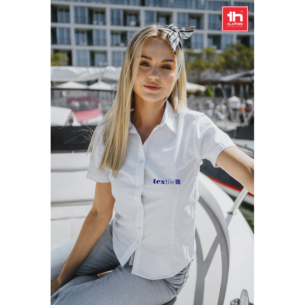 Oxfordská dámská košile, 70% bavlna a 30% polyester (130 g/m²). Krátký rukáv. Přiléhavý střih. Kapsa na levé straně. Léga se 7 perlovými knoflíky. 2 záševky na zadním a předním dílu.