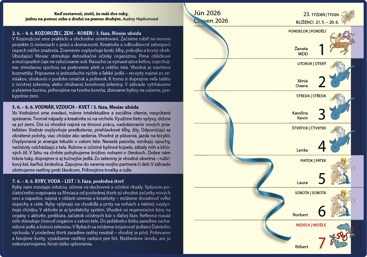 Oblíbený diář s graficky propracovaným týdenním kalendářem vám zpříjemní každý týden novým tématem spolu s praktickými radami ovlivněnými fázemi Měsíce. Slovenský text a kalendárium ve slovenštině , druhým jazykem kalendáře je čeština.