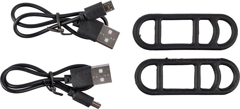 ABS a silikonová dobíjecí cyklistická světla se 3 LED světly se 4 režimy svícení a kapacitou baterie 650 mAh. Jednotlivě baleno v hnědé kartonové krabici. Materiál: plast. Rozměry: 10,7 x 3,5 x 4,7 cm. Rozměr balení: 14,3 x 11 x 4,5 cm.