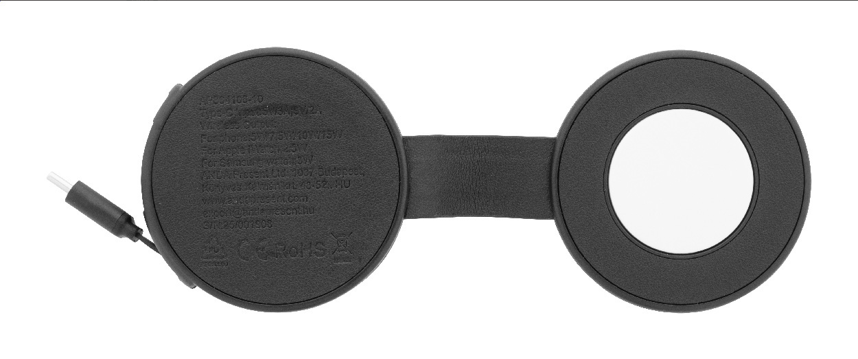 Luxusní skládací bezdrátová nabíjecí sada z recyklované PU kůže s magnetickou bezdrátovou rychlonabíječkou (15 W), sekundární bezdrátovou nabíječkou (2,5 W) pro chytré hodinky (Apple® a Samsung®) a vestavěným teleskopickým nabíjecím kabelem USB-C. Včetně samolepícího kovového kroužku pro použití magnetické funkce na jakémkoli bezdrátově nabíjecím zařízení. Kompatibilní s iPhone® 12 nebo novějším. Bezdrátové připojení: Ano. USB kabel je součástí balení: Ano