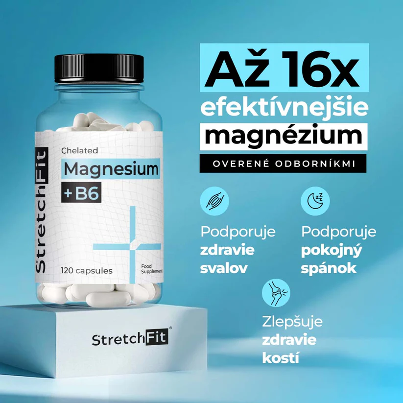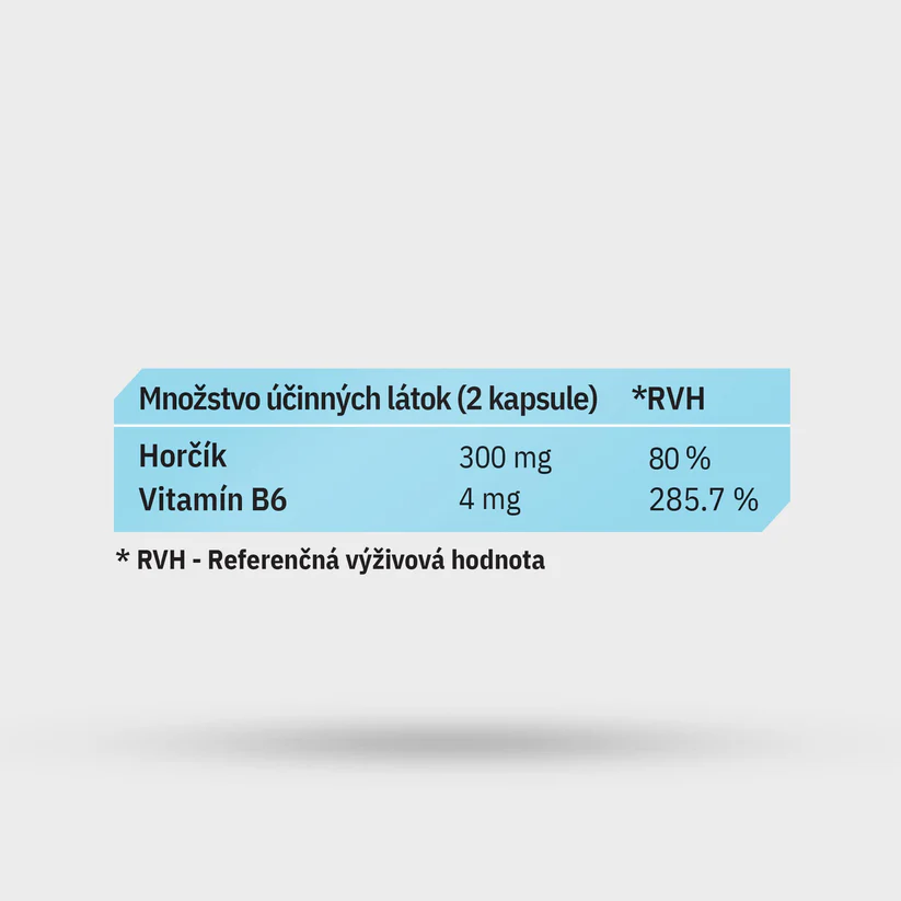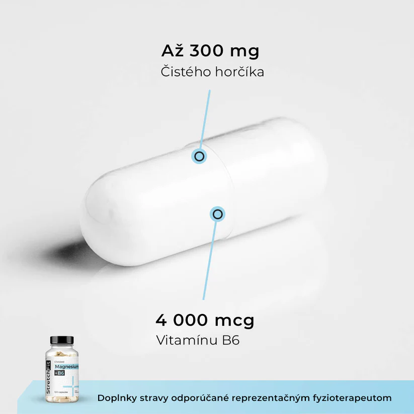 Vysoce vstřebatelné chelátové magnesium bisglycinát s vitamínem B6 (dávka 2 kapsle denně – 300mg Mg + 4mg B6) podporuje normální funkci svalů, nervového systému, zmírňuje únavu a přispívá k psychické pohodě i kvalitnímu spánku. Výrobek doporučený fyzioterapeuty a vhodný pro aktivní lidi. Složení: bisglycinát hořečnatý, vitamín B6 (pyridoxin hydrochlorid), kapsle vyrobená z hydroxypropyl metylcelulózy a vody.