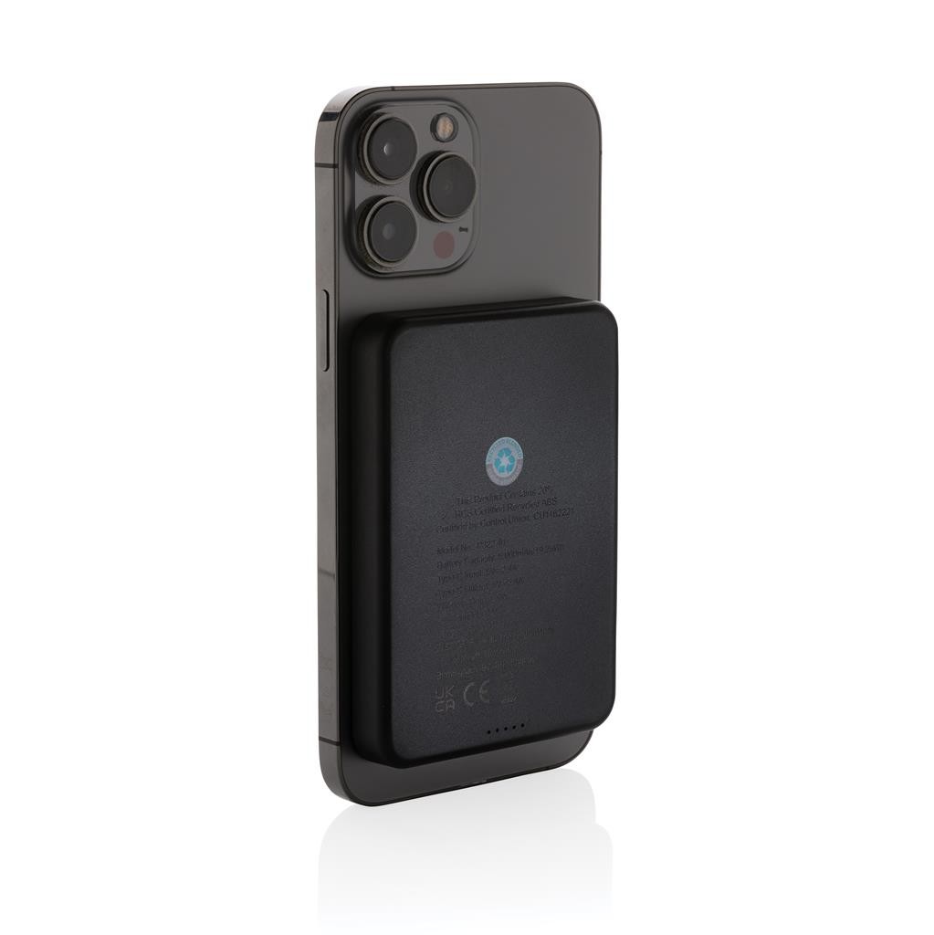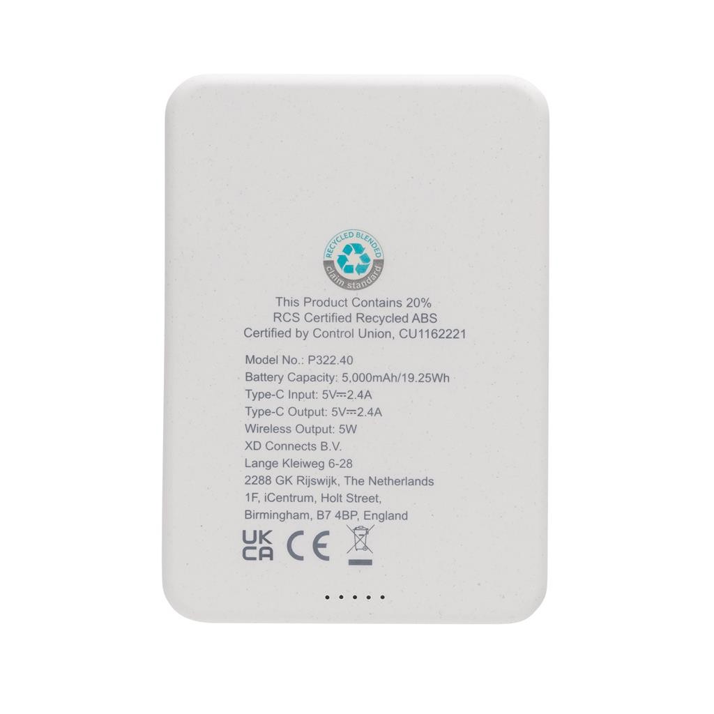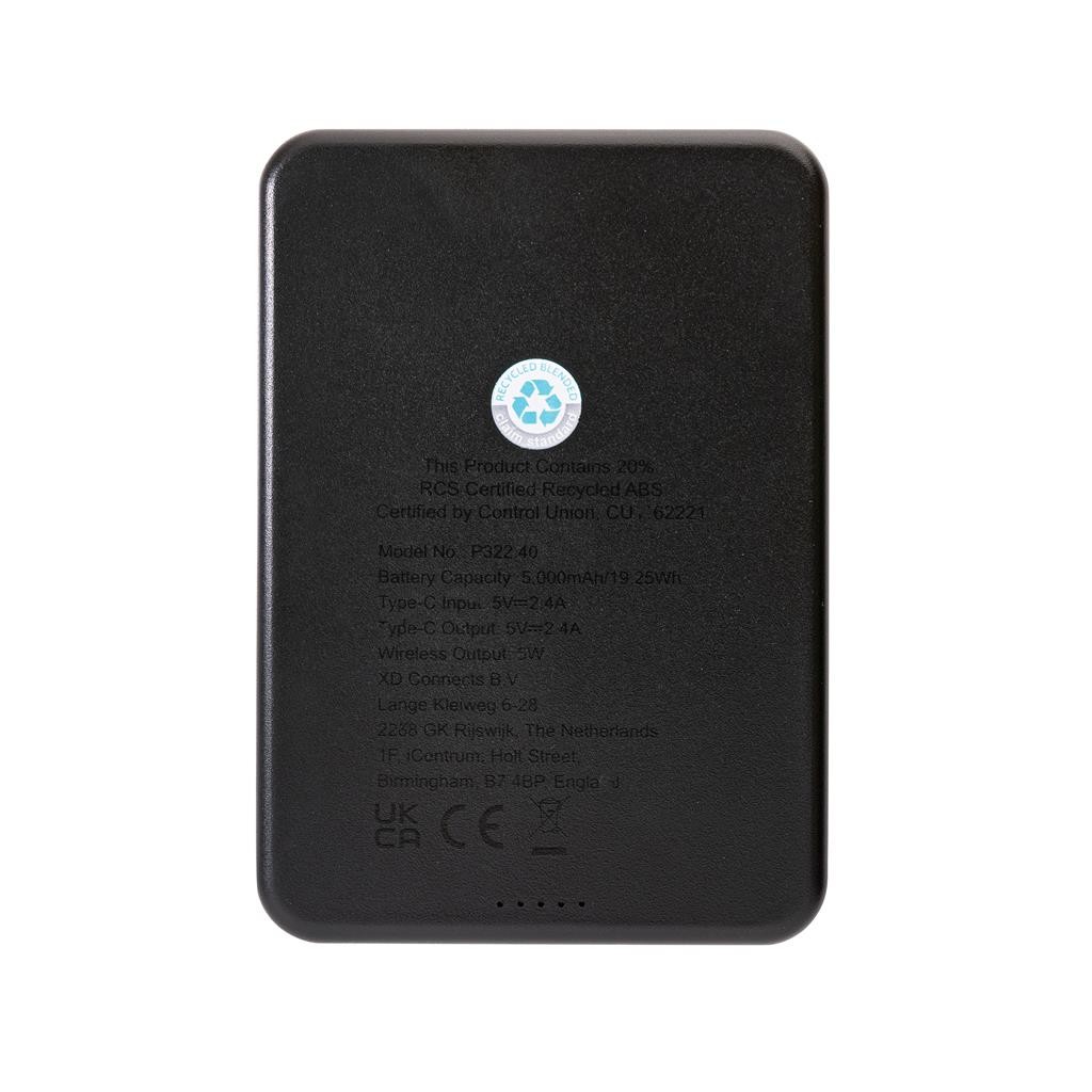 Kapesní powerbanka 5 000 mAh s magnetickým bezdrátovým nabíjením 5 W. Vyrobená z recyklovaného ABS plastu s RCS certifikací. RCS (Recycled Claim Standard) je globální standard, který umožňuje ověřit použití recyklovaného materiálu v produktu napříč celým dodavatelským řetězcem. Celkový podíl recyklátu dle váhy produktu: 20 %. Kvalitní lithium polymerová baterie řady A s kapacitou 5 000 mAh. Světelné indikátory stupně nabití. USB C vstup: 5V/2,4A. USB C výstup: 5V/2,4A, bezdrátový výstup: 5W. Včetně nabíjecího kabelu z recyklovaného TPE. Výrobek je kompletně bez PVC. Baleno v FSC kraftové dárkové krabičce. 1 baterií typu Li-poly súčasťou balenia.