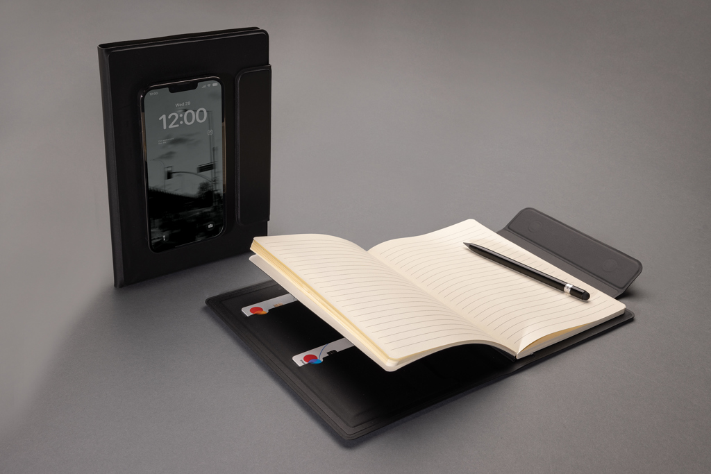 Portfolio A5 z recyklovaného polyesteru PU s magnetickým zavíráním a magnetickým držákem telefonu kompatibilním s iPhonem 12 a novějším. Uniter linkovaný papír, listy jsou certifikovány FSC® a mají 64 listů/128 stran. Gramáž papíru 80 g/m2, kapsa na dokumenty a 2 sloty na vizitky. Zápisník je doplnitelný.