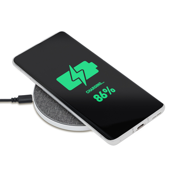 Indukční nabíječka ze šedé tkaniny melanž v nabíjecím standardu Qi pro nabíjení mobilních zařízení. Nabíjecí výkon 10 W. Kabel je součástí.