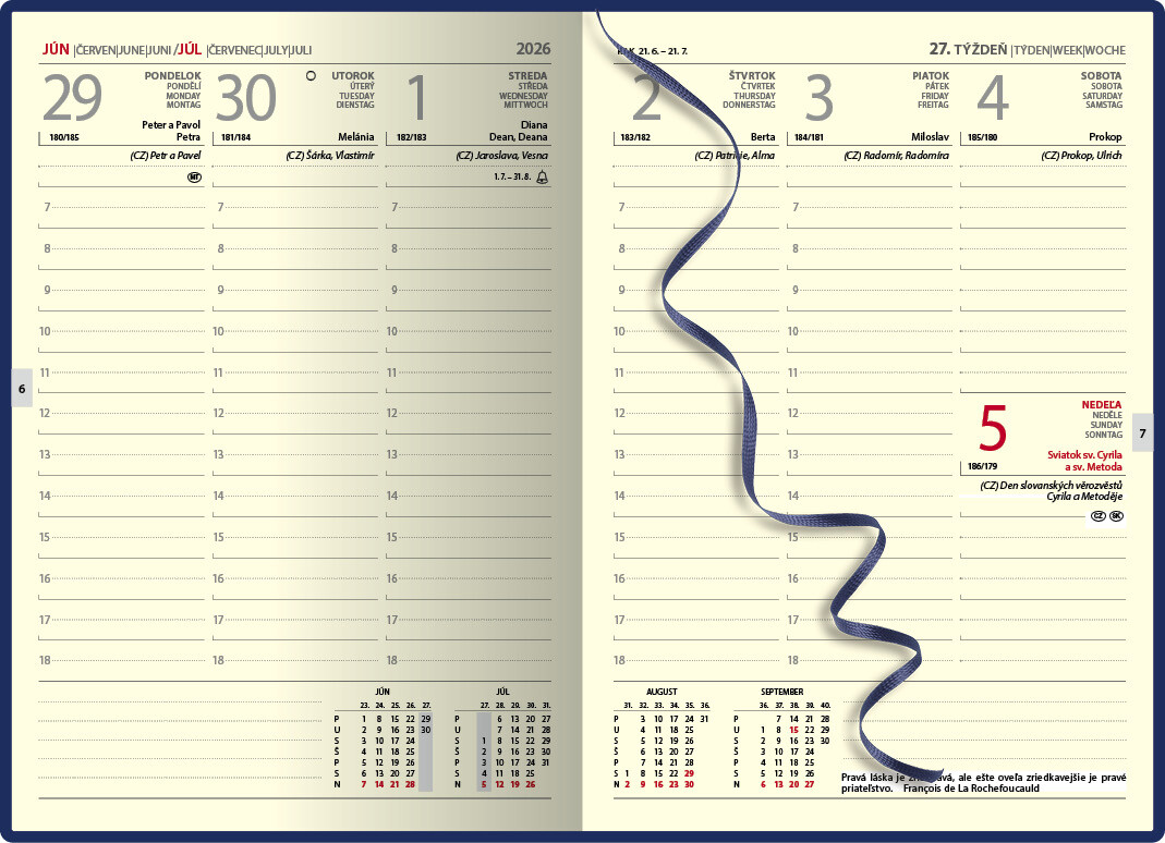 Zajímavým designem týdenního diáře je kombinace dvou barev materiálu obálky. Diář je v pevné vazbě s přední stranou z pěnového kartonu, kovovou nálepkou s letopočtem, barevným štítkem a ozdobným kontrastním prošitím. Slovenské přehledné kalendárium.
