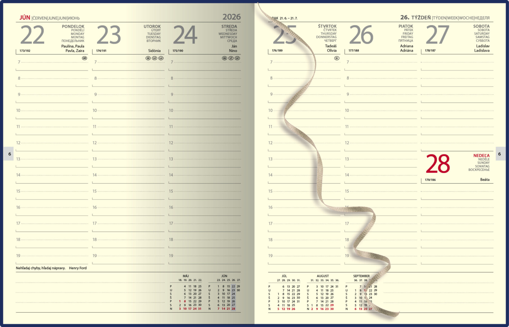 Luxusní týdenní diář potažený kvalitní termo-citlivou vrstvou s přehledným kalendáriem na celý týden. Diář je v pevné vazbě s přední a zadní stranou z pěnového kartonu, doplněný ozdobným prošitím přes 1/5 diáře a dvěma laky. Na štítku z ekokůže je vyražen letopočet. Součástí je slovenský kalendář.