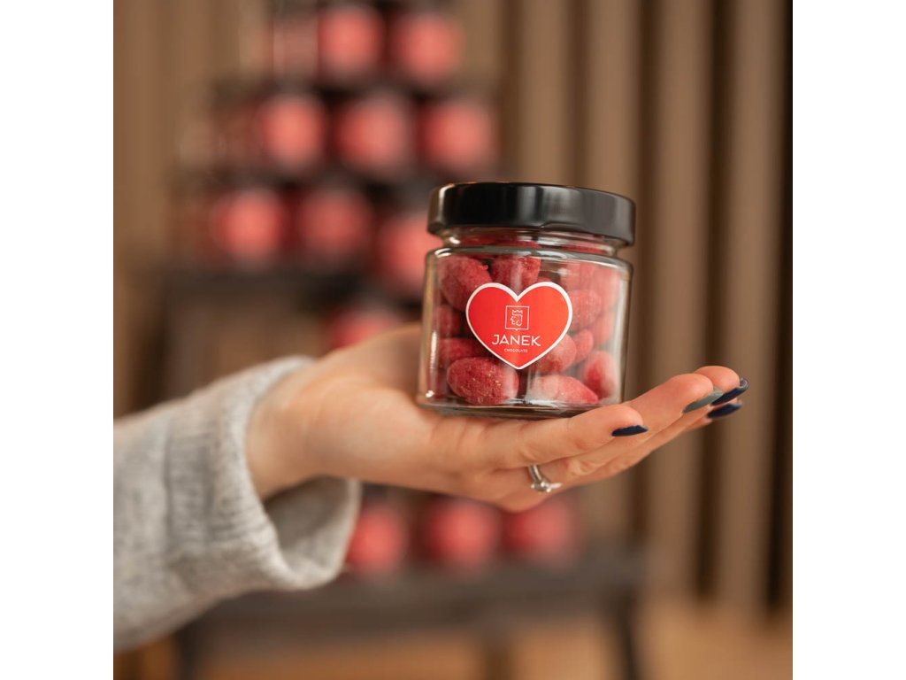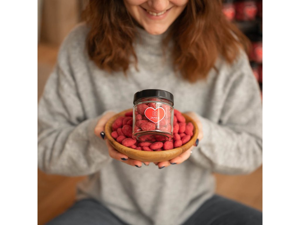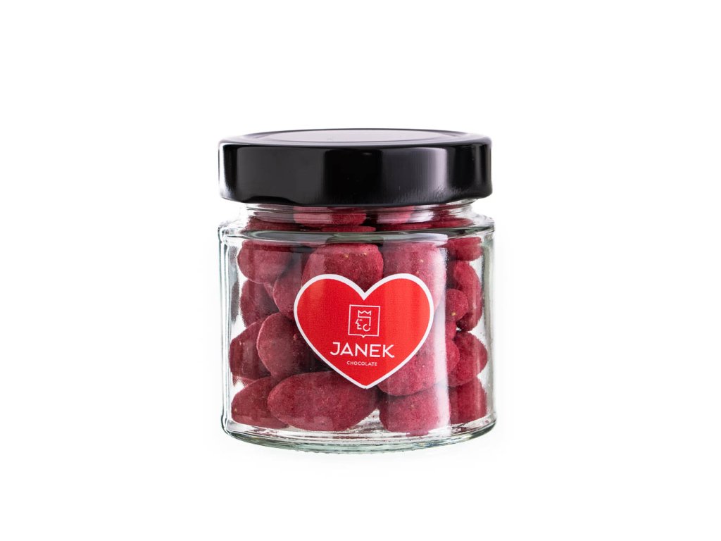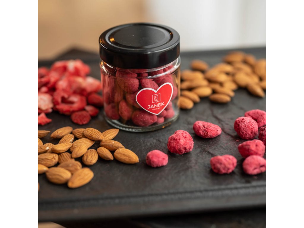 Dopřáli jsme mandlím koupel v bílé jahodovo-malinové čokoládě. A pak jsme je šupli do sklenice. Svět je s nimi hned růžovější. Kéž by ne, když je to taková lahůdka. Mandle jsme pořádně vykoupali v naší speciální bílé jahodové a malinové čokoládě. Když ji ochutnáte, budete se chtít vykoupat také. Budou se vám sbíhat sliny.