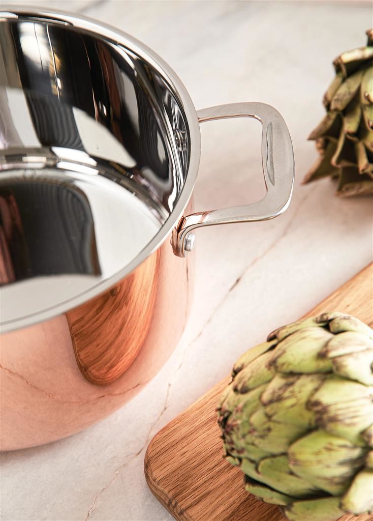 Exkluzivní třívrstvý měděný hrnec s objemem 6l. Vnější měděná vrstva, prostřední hliníková vrstva, vnitřní vrstva z nerezavějící oceli pro snadné mytí. Měď a hliník zajišťují rychlé zahřátí a rovnoměrnou distribuci tepla. Spodní část ze zesílené nerezavějící oceli pro použití na indukci. Ucha z nerezavějící oceli zůstavají při vaření chladnější. Vhodné pro všechny typy sporáků včetně indukce.