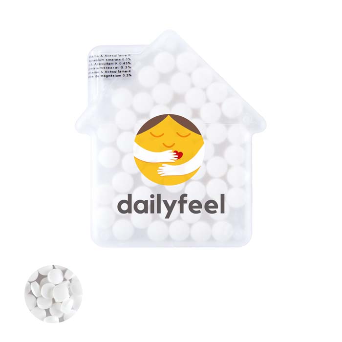 Mentolky bez cukru v krabičce ve tvaru domu, označení přísad. Vyberte si bílý nebo průhledný plastový dávkovač a přidejte své logo.