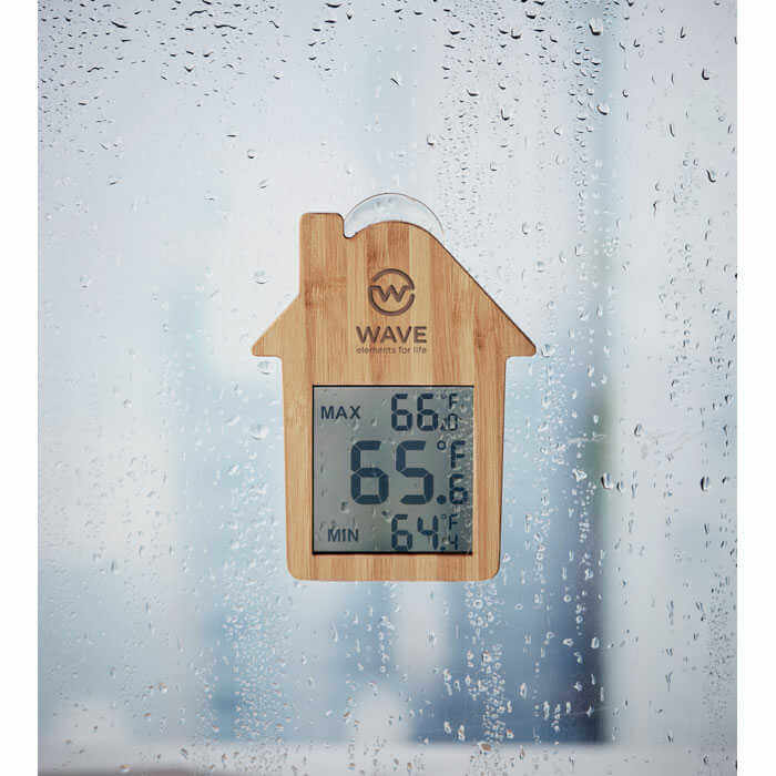 Bambusová meteostanice ve tvaru domečku s přísavkou na zadní straně. S tímto teploměrem budete vždy vědět, jaká je teplota uvnitř vašeho domova. Na LED displeji se zobrazuje aktuální, minimální a maximální teplota. Na zadní straně je přísavka pro zavěšení malého domečku na okno, skříň nebo jinam. Součástí balení je 1 baterie LR44. Bambus je přírodní materiál, u každého jednotlivého kusu se mohou vyskytnout drobné odchylky v barvě a velikosti, které mohou mít vliv na finální podobu potisku.