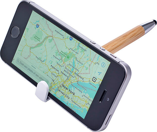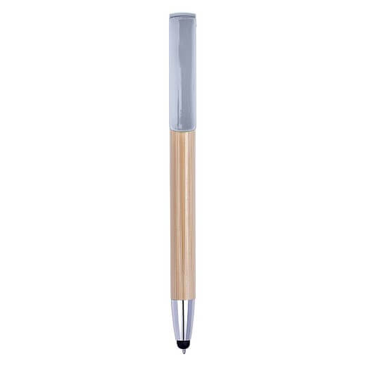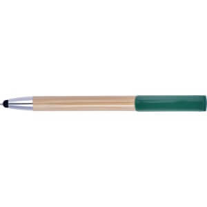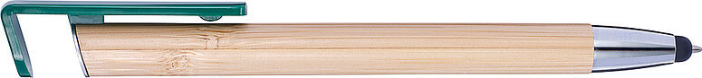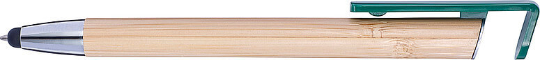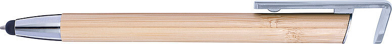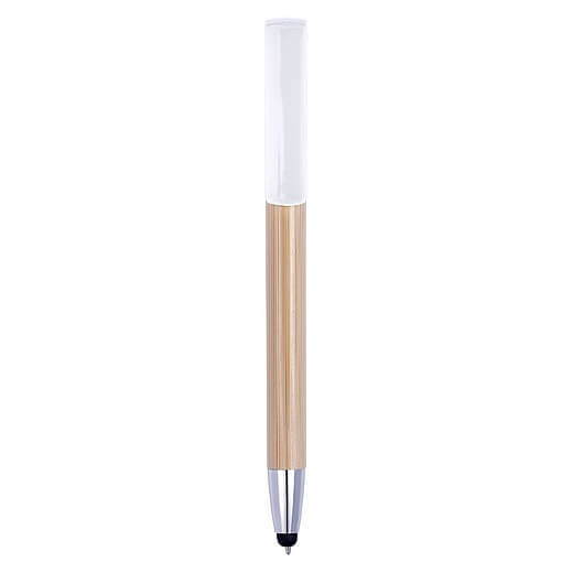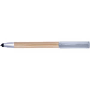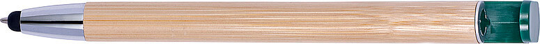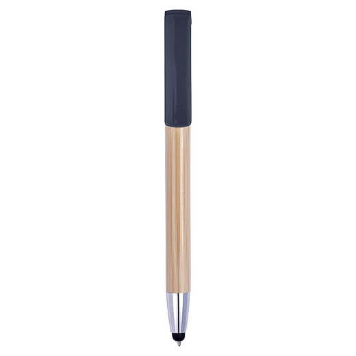 Bambusové kuličkové pero s modrým inkoustem. Gumová špička je vhodná pro dotekové obrazovky. Držák je vyroben z bambusu, hrot a spona jsou plastové. Klip funguje jako tlačítko.