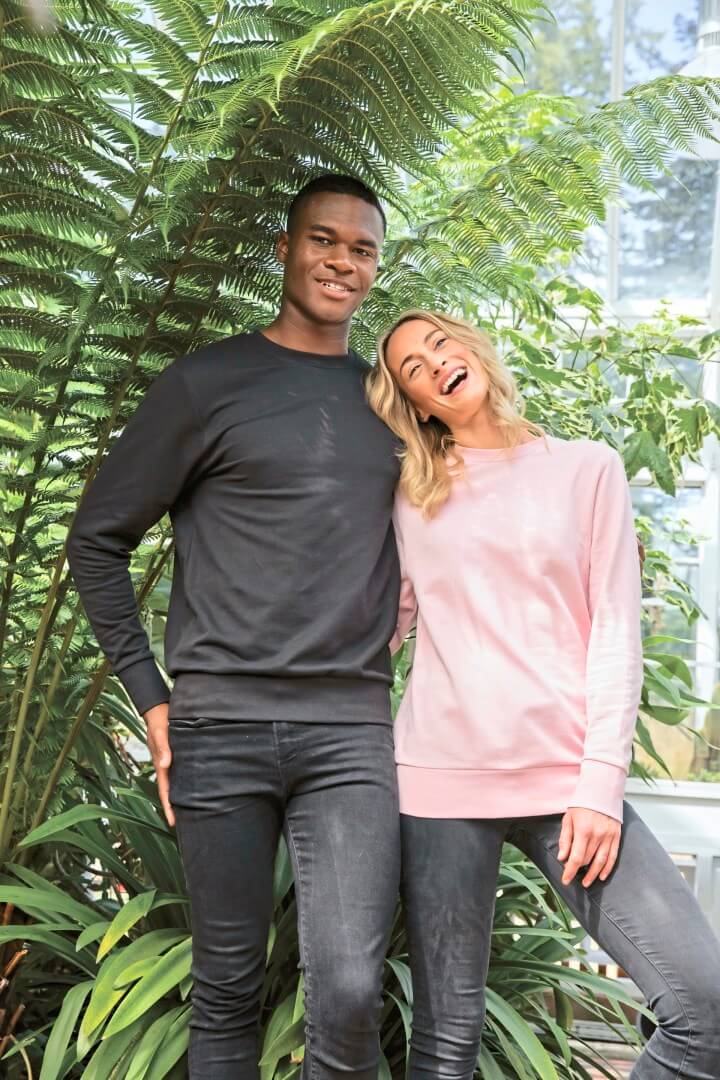 Organická bavlna nebo přechod na organickou bavlnu / recyklovaný polyester (rPET) | Česaný flís | Unisex styl | Vsazené rukávy | Žebrování na límci, manžetách a spodním lemu | Zpevňovací páska za krkem se vzorem rybí kosti ve stejné barvě | Vsadka vzadu na krku | Odtrhávací štítek u krku | Štítek s QR kódem pro sledování dodavatelského řetězce a kontrolu pozitivního dopadu nákupu organického materiálu | Štítek o údržbě vyrobený z organické bavlny