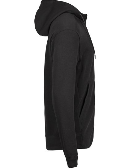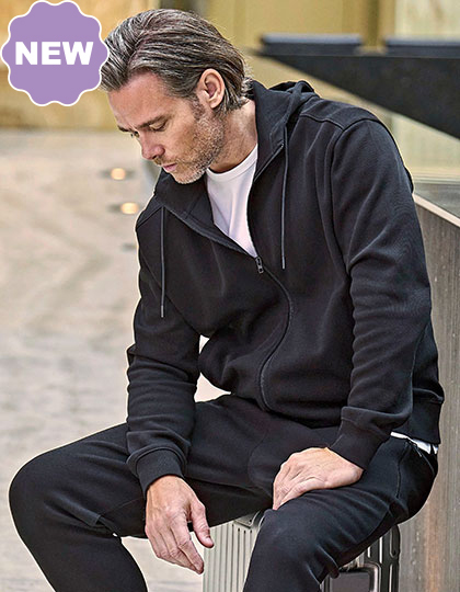 Kruhově dopřádaná bavlna. Žebrovaný interlock. Zip po celé délce. Dvouvrstvá kapuce. Dvě otevřené přední kapsy. Žebrování s elastanem. Zpevňovací páska za krkem se vzorem rybí kosti. Žebrování s plochou zadní stranou. Zip SBS.