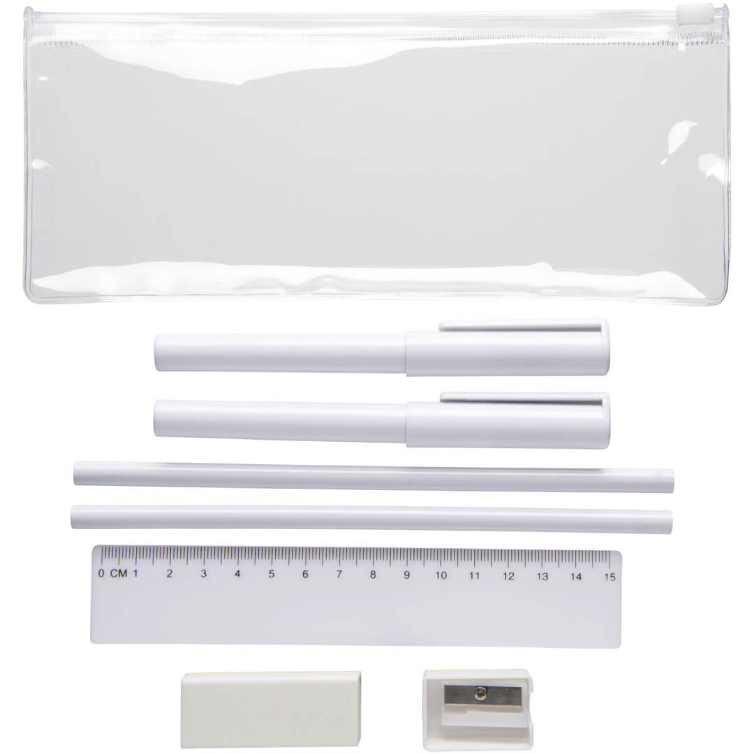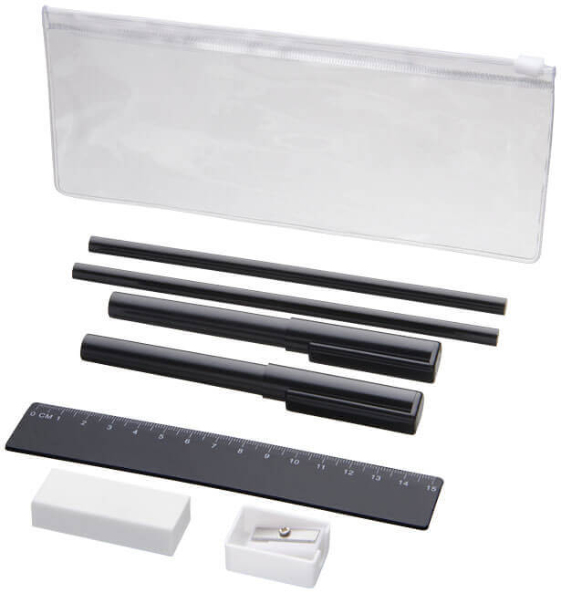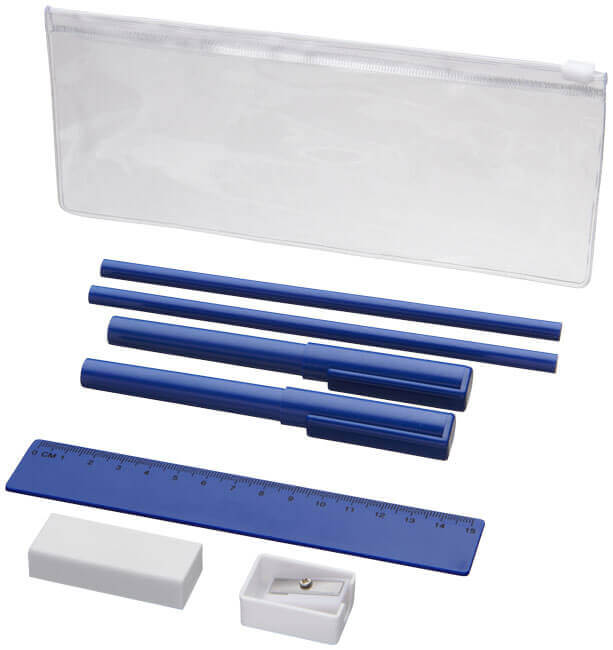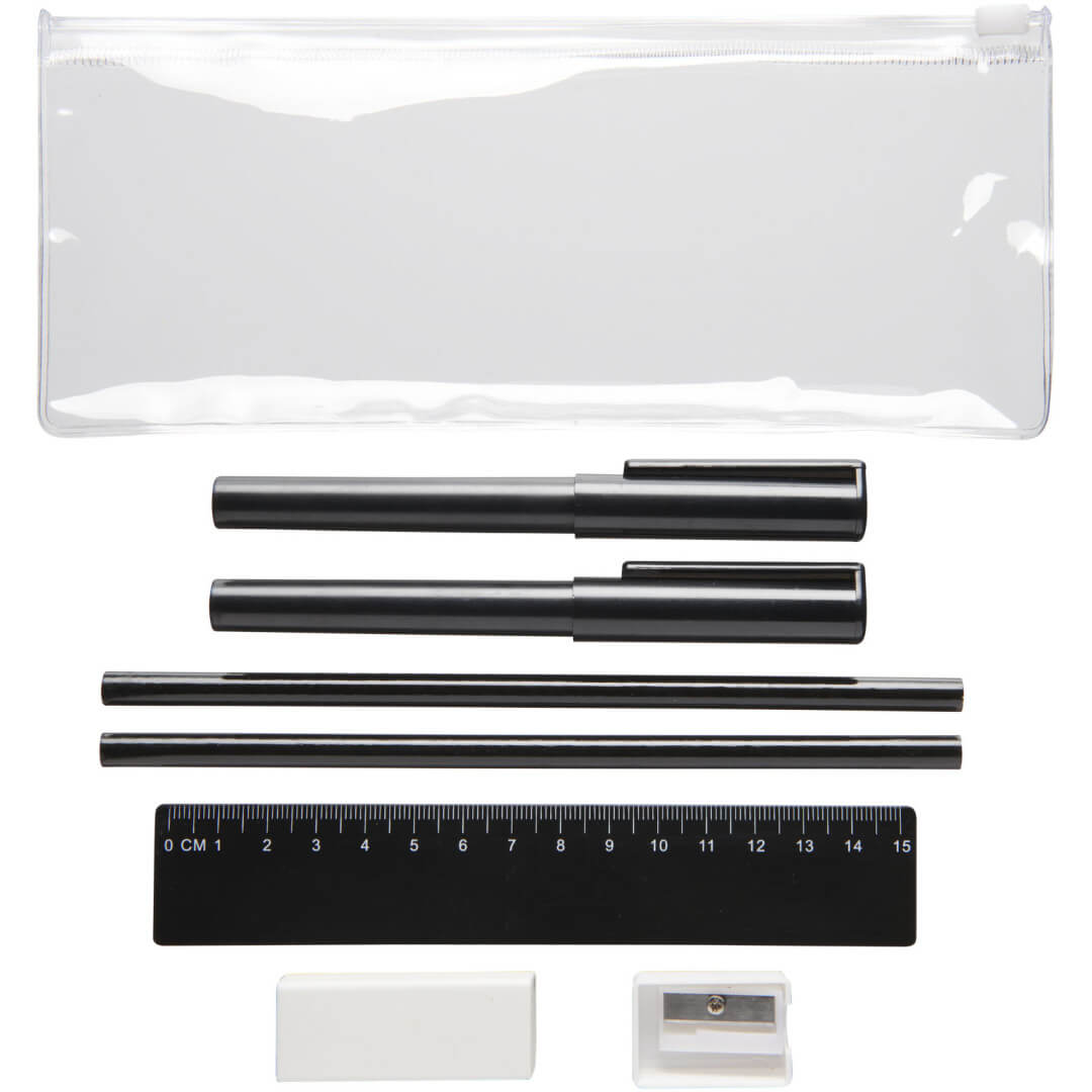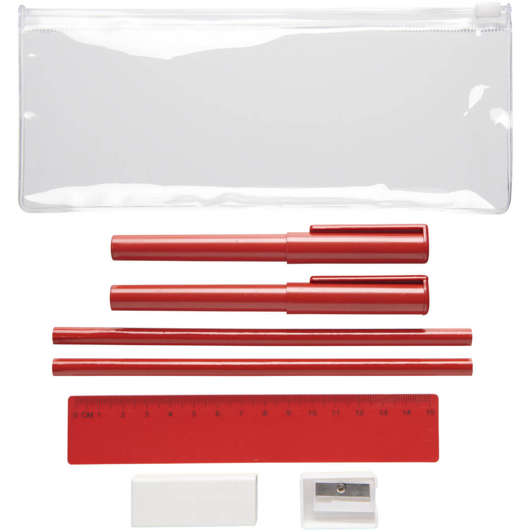 PVC penál se dvěma kuličkovými pery (1 s černým inkoustem, druhé s modrým), 2 tužkami, pravítkem, ořezávátkem a gumou. ABS plast, AS Plast, Polystyren .