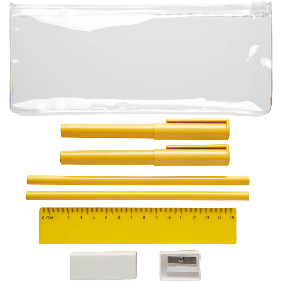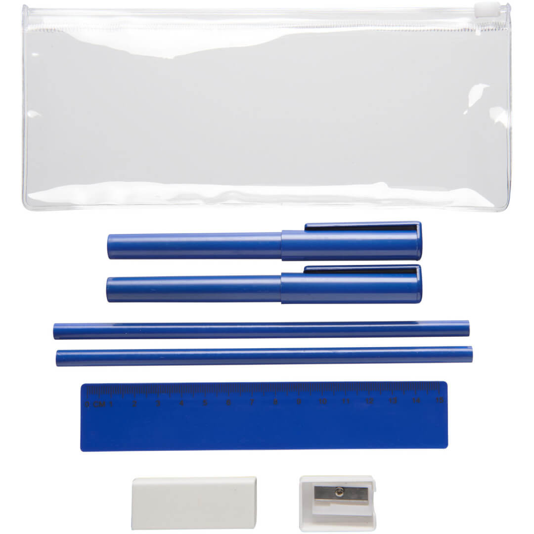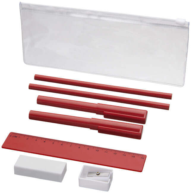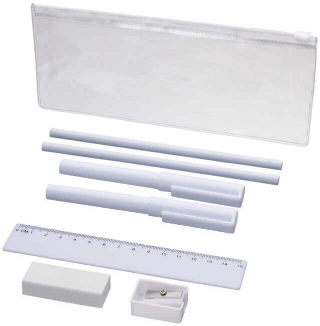 PVC penál se dvěma kuličkovými pery (1 s černým inkoustem, druhé s modrým), 2 tužkami, pravítkem, ořezávátkem a gumou. ABS plast, AS Plast, Polystyren .