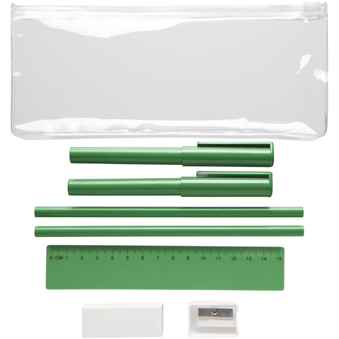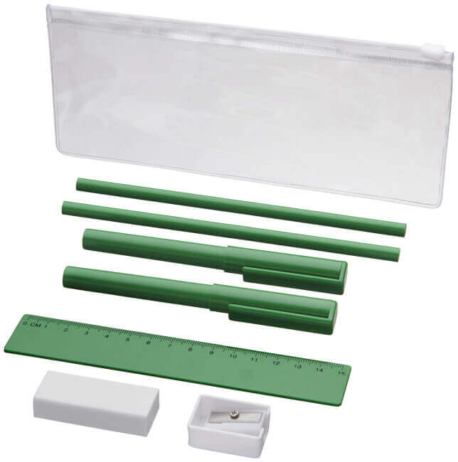 PVC penál se dvěma kuličkovými pery (1 s černým inkoustem, druhé s modrým), 2 tužkami, pravítkem, ořezávátkem a gumou. ABS plast, AS Plast, Polystyren .Typy potlačí/dekor:: Tamponovy tisk, SitotiskFarba HEX: 067f58Farba tuhy