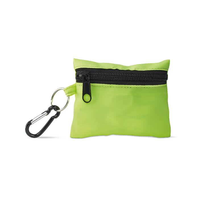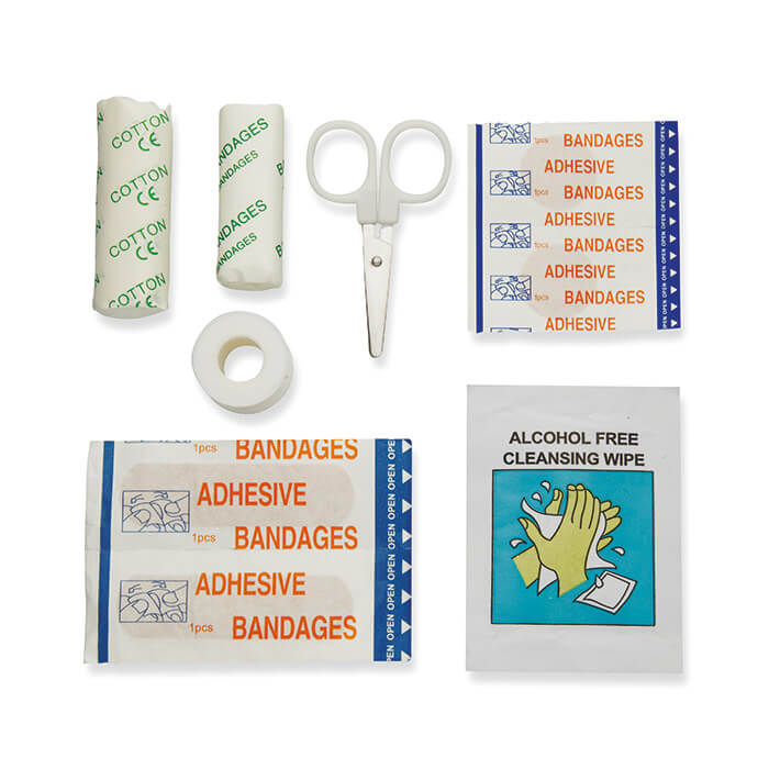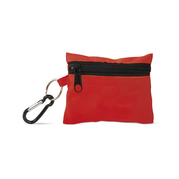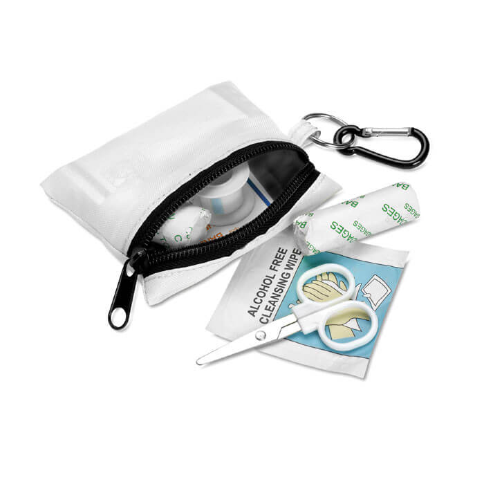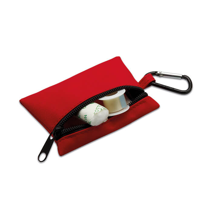 Domácí lékárnička v pouzdře s karabinou. Obsahuje nůžky, vlhký kapesník, obvaz, vatové tyčinky a 5 kusů náplastí. Vše zabaleno v zářivém PE sáčku s karabinou.