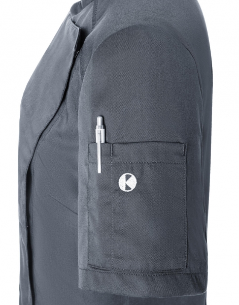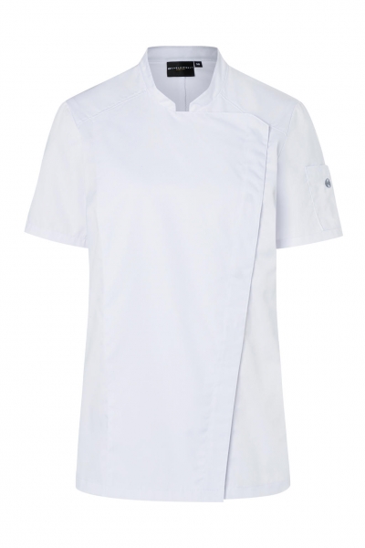 150 g/m², 50% polyester, 50% bavlna (kepr), popruh na zadním límci pro upevnění bryndákové zástěry (zabraňuje uklouznutí), skrytý panel na patentky vyrobený z velmi lehké tkaniny, krátké rukávy, našitá kapsa na rukávu na levé straně přihrádkou na pero, perfektně se hodí pro pohodlnou práci v teplém prostředí, vysoce rafinovaný, předzaražený, stálobarevný, nenáročný na údržbu, vhodný pro průmyslové prádelny, lze prát do 95°C, štíhlá silueta