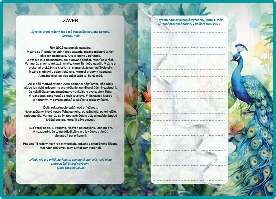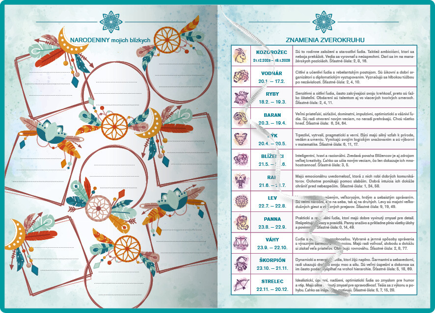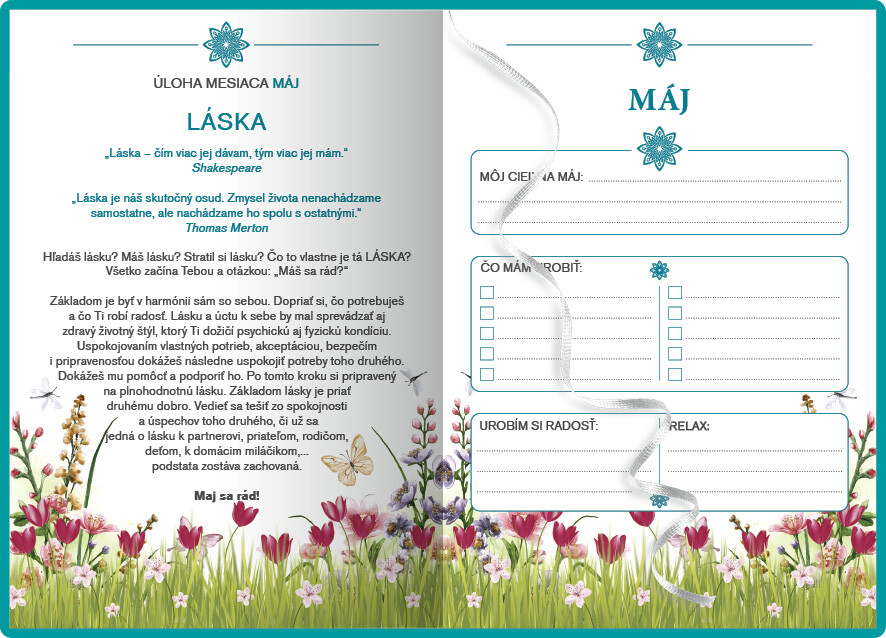 Oblíbený diář s graficky propracovaným týdenním kalendářem vám každý týden udělá radost novým mottem. Každý měsíc v něm najdete přehled svých cílů či nápadů, k nimž vás na začátku každého měsíce povzbudí motivační texty. Ve volných chvílích si můžete vybarvovat tematické antistresové omalovánky. Obálka diáře je z tvrdých desek s laminem soft touch, efektní ražbou a 3D lakem. Vhodné jako dárek.