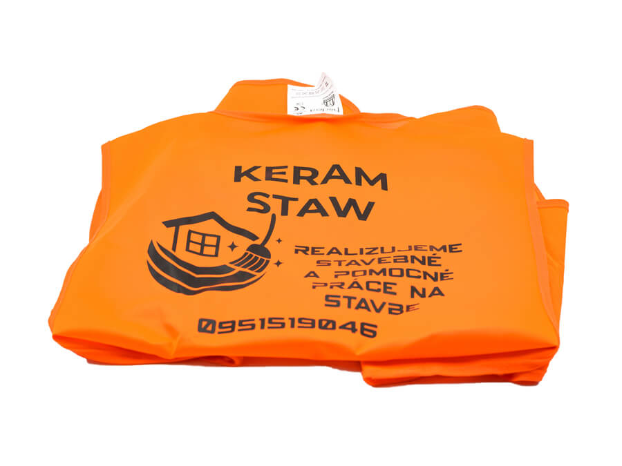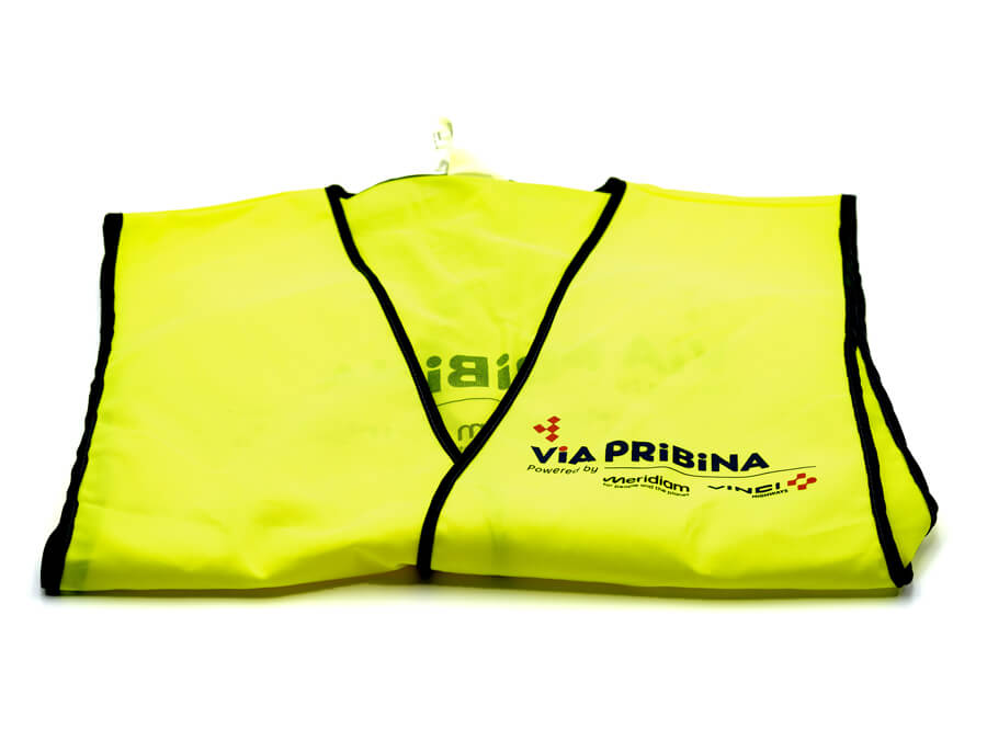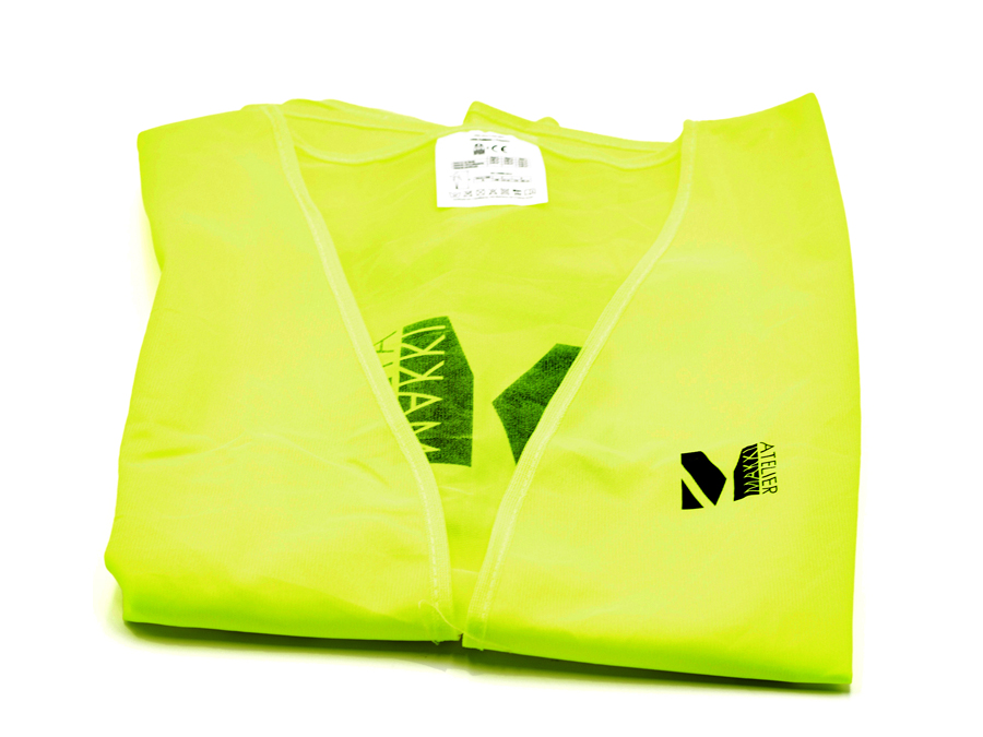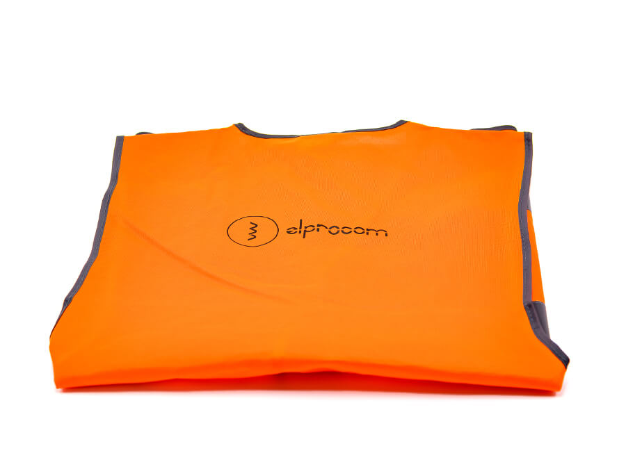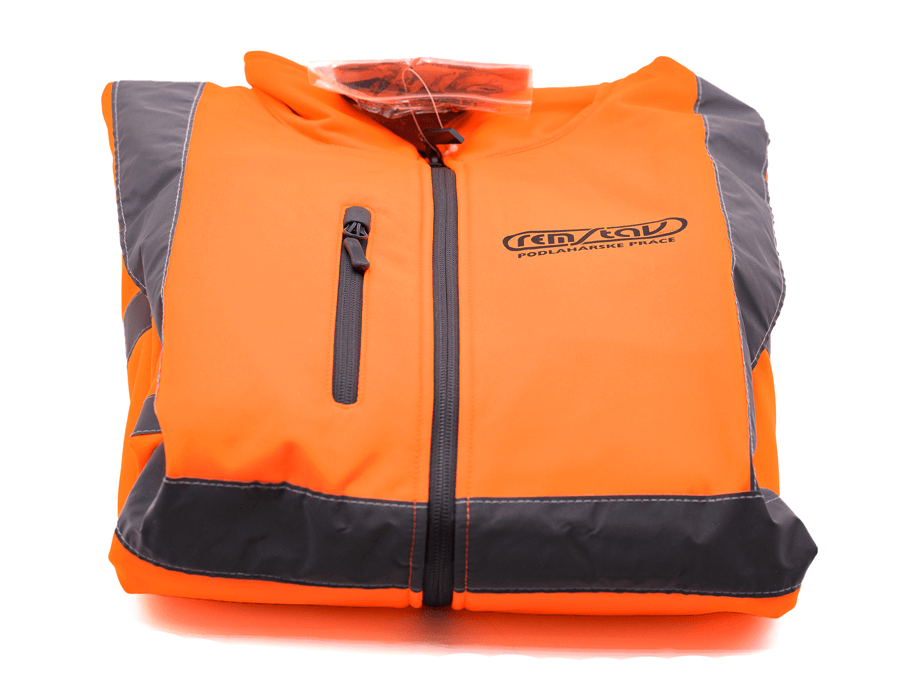 100% polyester. Zapínání na suchý zip zaručuje, že se zip neotevře v důsledku proudění vzduchu, gumové pásy uvnitř omezují vlání při vysoké rychlosti, dva 5 cm široké reflexní pruhy, dva reflexní pruhy přes ramena, certifikované podle EN ISO 20471, reflexní vlastnosti podle Normy EN pro 25 pracích cyklů na 40 °