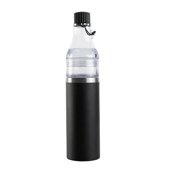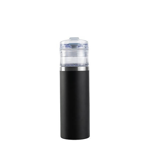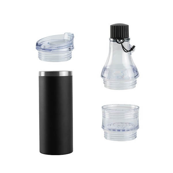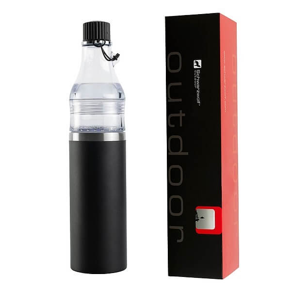 Multifunkční láhev na nápoje 4v1 značky Schwarzwolf. Láhev se skládá z nerezového termohrnku s plastovým víčkem, které je možné vyměnit za plastový nástavec a vytvořit z hrnku sportovní láhev. Vložením sítka vytvoříte láhev nebo termohrnek s infuzérem. Baleno v dárkové krabičce Schwarzwolf. Objem: termohrnek – 400 ml, láhev s infuzérem – 600 ml. Materiál: nerezová ocel, plast. Doporučená technologie tisku: laser L1. Maximální velikost tisku: 30 × 50 mm. Rozměry: základní černá část – O 7,2 × 17,3 cm, s maximální nastavitelnou částí – O 7,2 × 31,3 cm.