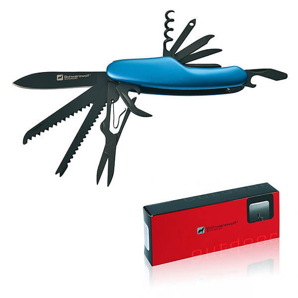 Značkové multifunkční nářadí Schwarzwolf v modré barvě s 11 nástroji. Baleno v dárkové krabičce Schwarzwolf. Materiál: hliník/nerezová ocel. Rozměry: v zavřeném stavu 9 × 2 × 3 cm.