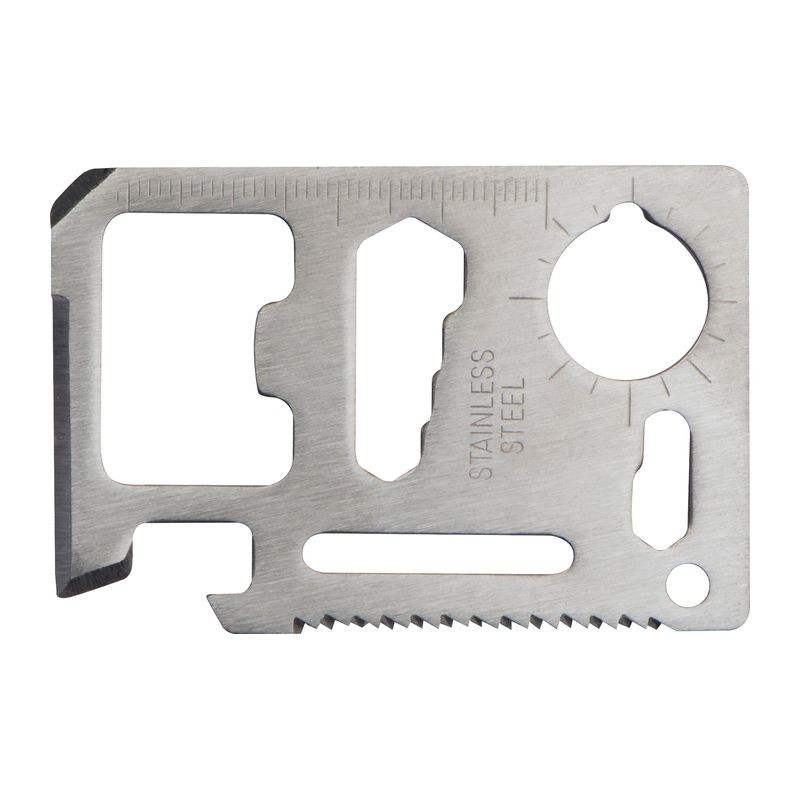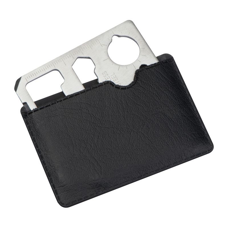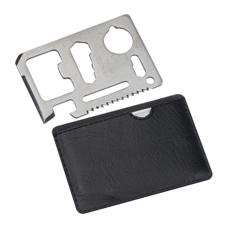 Multinářadí 15v1 vyrobeno z nerezavějící oceli ve tvaru sáčku. Praktický společník má tyto funkce: PU pouzdro, otvírák na konzervy, nůž, šroubovák, otvírák na láhve, pravítko, 4 imbusové klíče (6/7/8/10 mm), úhloměr, 2 imbusové klíče (4/5 mm), závěsné oko , pila, motýlový klíč.