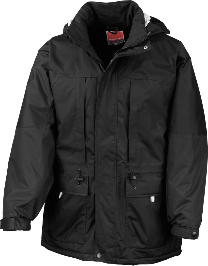 200g/m, 200g/m², StormDri polyester s PVC vrstvou, vnitřní vrstva: polyester, podšívka: 190T polyester Tafetta zesílené podlepené švy, 2 boční kapsy, 2 velké přední kapsy, vnitřní kapsu a kapsu na mobil. Spodní lem a pas se dá stáhnout pomocí šňůrek. Kapuce je skrytá v límci a dá se odepnout. Na rukávech jsou elastické nastavitelné manžety na suchý zip. z prodyšné