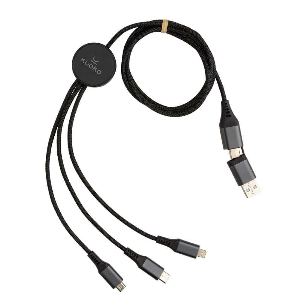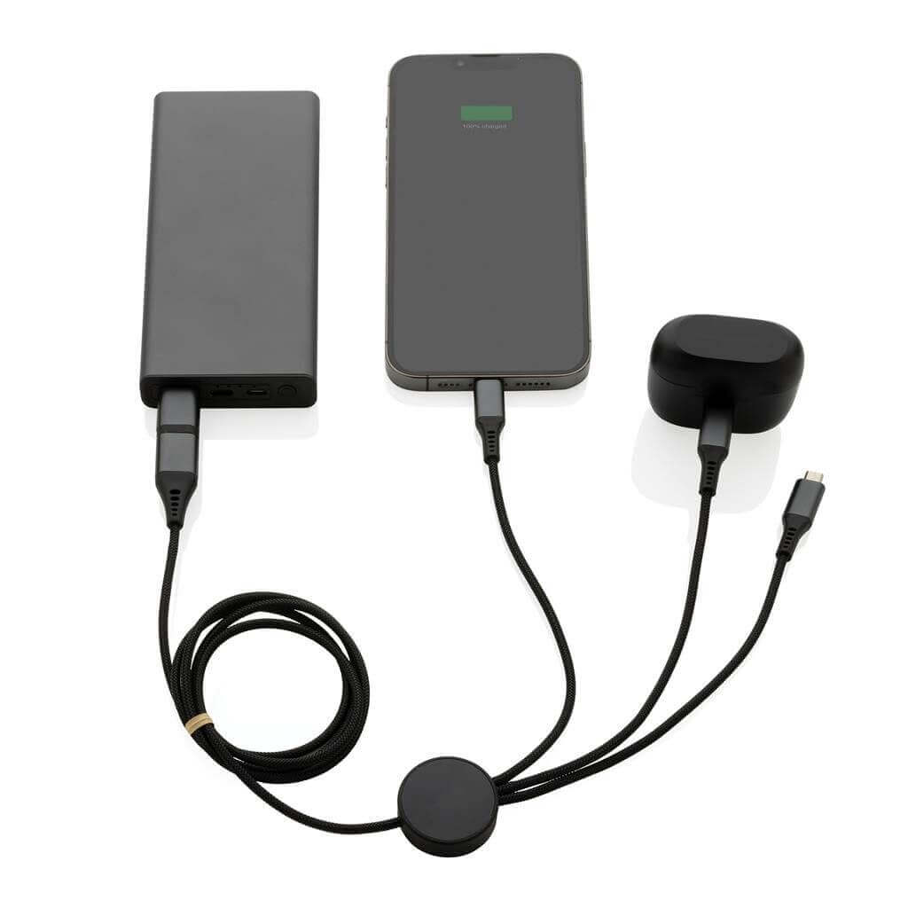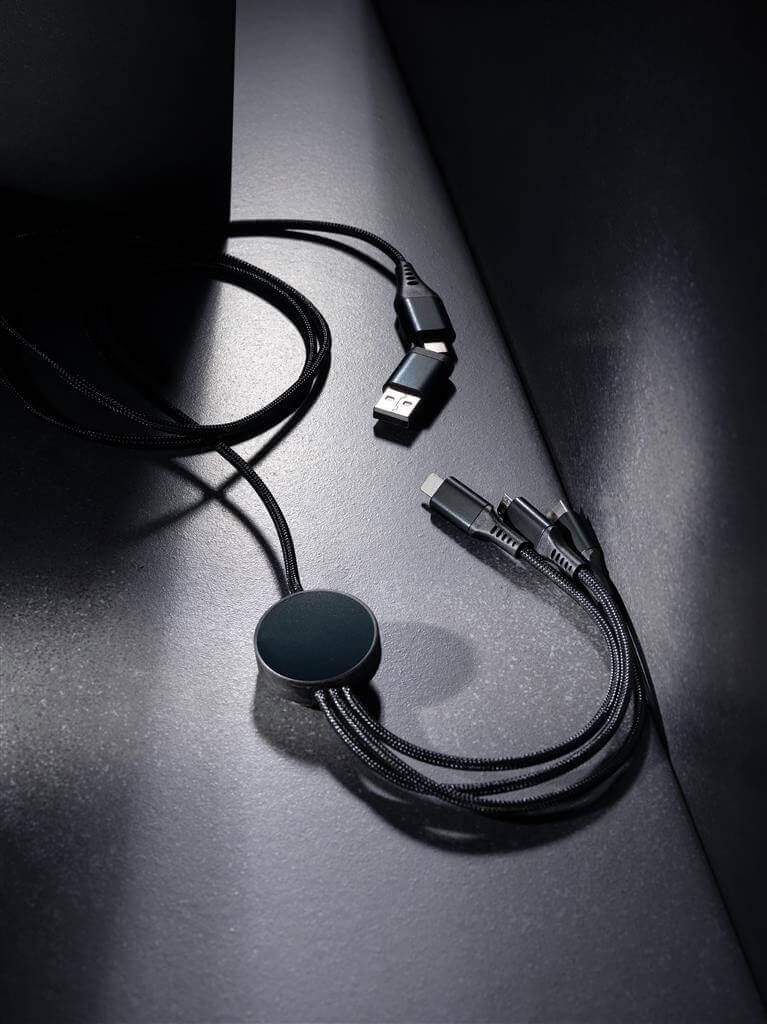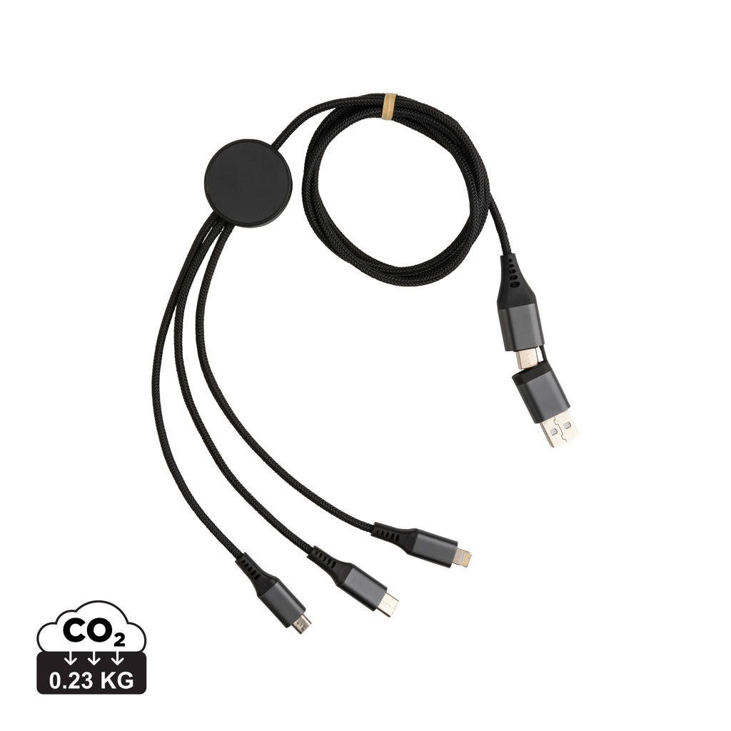 Nabíjecí kabel 6 v 1 vyrobený z RCS recyklovaného hliníku, recyklovaného TPE a recyklovaného PET. RCS (Recycled Claim Standard) je globální standard, který umožňuje ověřit použití recyklovaného materiálu v produktu napříč celým dodavatelským řetězcem. Podíl použitého recyklovaného materiálu vzhledem k celkové váze produktu: 65 %. Hliník při recyklaci neztrácí své vlastnosti, lze tak recyklovat opakovaně. Kabel disponuje 5 konektory: USB C/USB A vstup, USB C/micro USB/iOS výstup. USB C je vhodné pro nabíjení moderních telefonů, ale i MacBooků. USB A má dvojí funkci (vstup i výstup) pro nabíjení jakéhokoliv zařízení z jakéhokoliv jiného zdroje. PET opletené kabely délky 120 cm. Vodné pro nabíjení i přenos dat. Podporuje rychlonabíjení 9V/2A. Baleno v FSC® dárkovém balení.