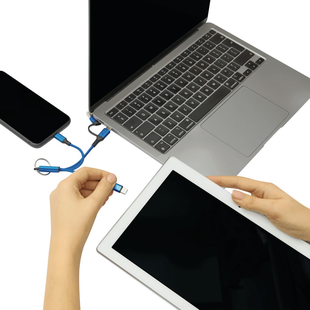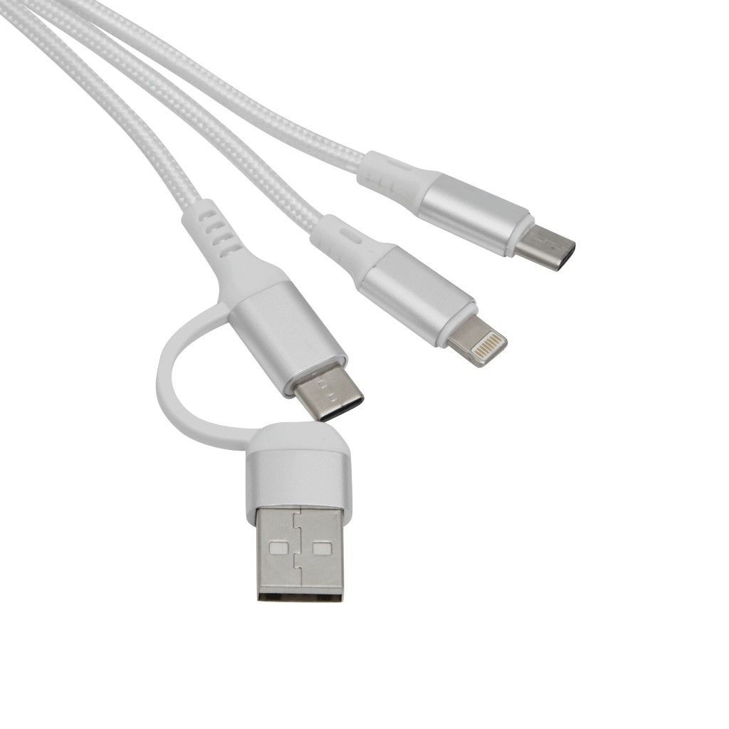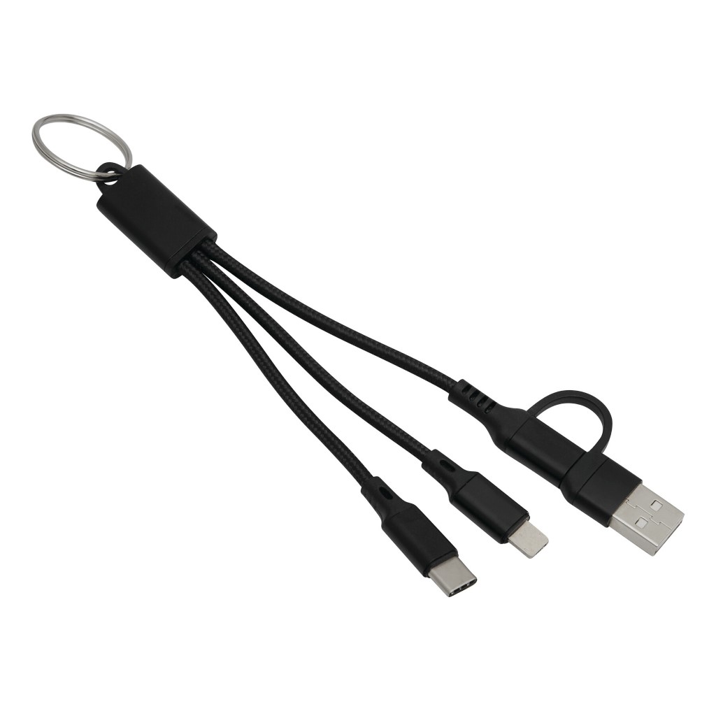 Nabíjecí kabel FANTAIL: k nabíjení elektronických zařízení, délka cca 18 cm, s kroužkem na klíče, včetně 2 nabíjecích zástrček: USB Type-C a kombinovaný konektor Micro-USB/Lightning, vstupní konektor USB Type-C, adaptér pro USB Type-A