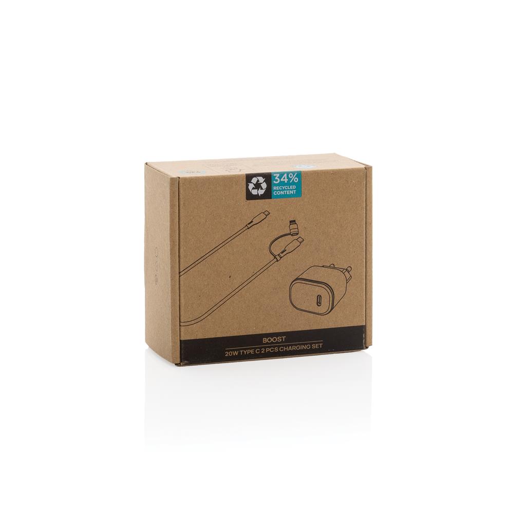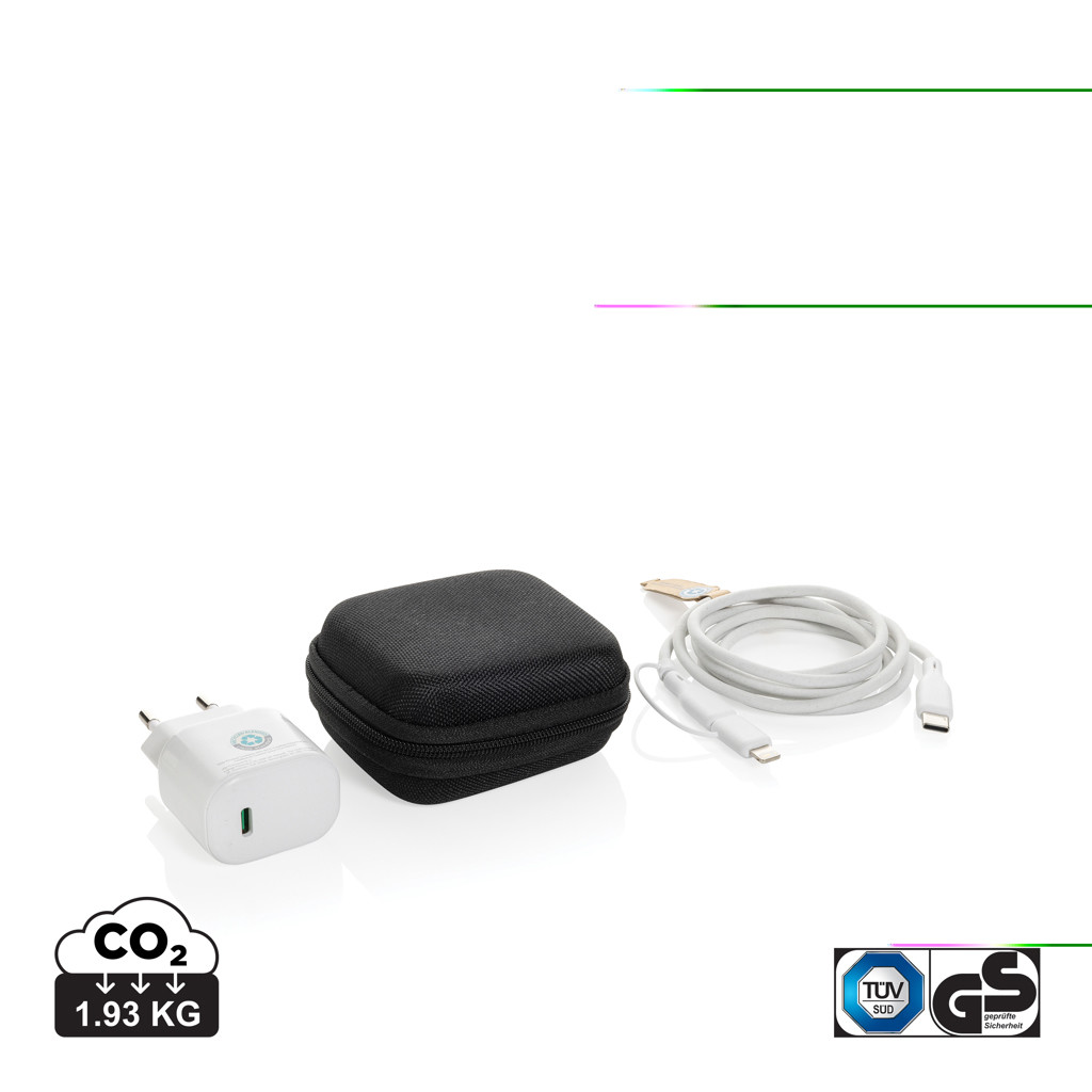 Sada 2 ks rychlonabíjecích 20W bezdrátových nabíječek. Vhodné pro telefony a jiná zařízení. Včetně 20W EU adaptéru s USB výstupem a 120cm rychlonabíjecím 60W nabíjecím kabelem (USB C na USB C/Lightning). Kabel podporuje přenos dat i nabíjení větších zařízení. Adaptér a kabel jsou vyrobeny z RCS recyklovaného PC, ABS a TPE. Včetně sáčky z snadný přenos z RCS recyklovaného PET. RCS certifikace zajišťuje garanci použití recyklovaného materiálu díky transparentnímu přehledu nad dodavatelským řetězcem. Celkový podíl recyklátu podle váhy produktu: 59 %. Vstup adaptéru: AC 100-240V, 50/60Hz, 0,6A. Výstup adaptéru USB C: 5.0V⎓3.0A,9.0V⎓2.22,12.0V⎓1.67A (20W Max). Baleno v FSC® krabičce. Bez PVC.