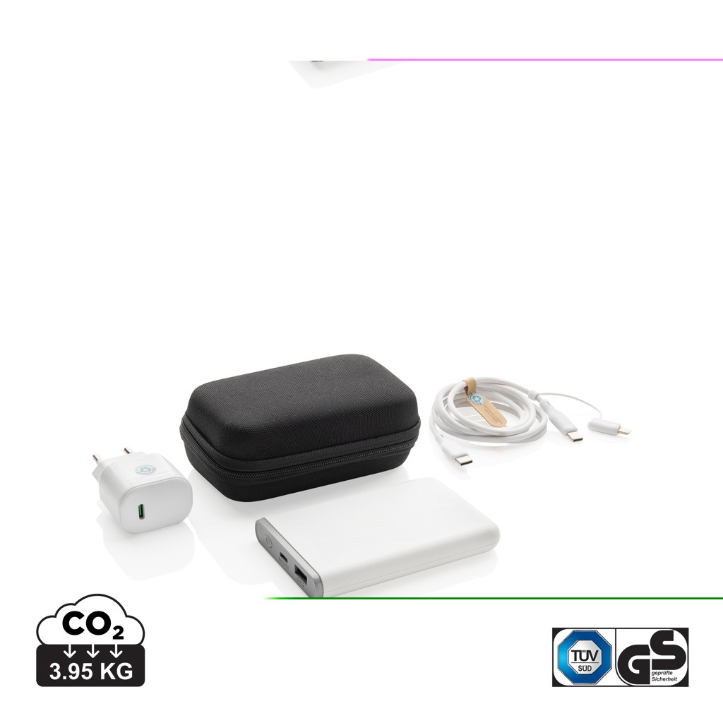 Sada 3 ks rychlonabíjecích 20W bezdrátových nabíječek. Vhodná pro telefony a jiná zařízení. Včetně 20W EU adaptéru s USB výstupem a 120cm rychlonabíjecím 60W nabíjecím kabelem (USB C na USB C/Lightning). Kabel podporuje přenos dat i nabíjení větších zařízení. Adaptér, powerbanka a kabel jsou vyrobeny z RCS recyklovaného PC, ABS a TPE. Baleno v sáčku vyrobeného také z recyklovaného PET s certifikací RCS. RCS certifikace zajišťuje garanci použití recyklovaného materiálu díky transparentnímu přehledu nad dodavatelským řetězcem. Celkový podíl recyklátu podle váhy produktu: 59 %. Vstup adaptéru: AC 100-240V 50/60Hz 0,6A; Výstup adaptéru USB-C: 5,0V⎓3,0A, 9,0V⎓2,22,12,0V⎓1,67A (20W Max). Výstup u powerbanky 5V⎓2,4A -USB-C Vstup: 5V⎓2,4A.