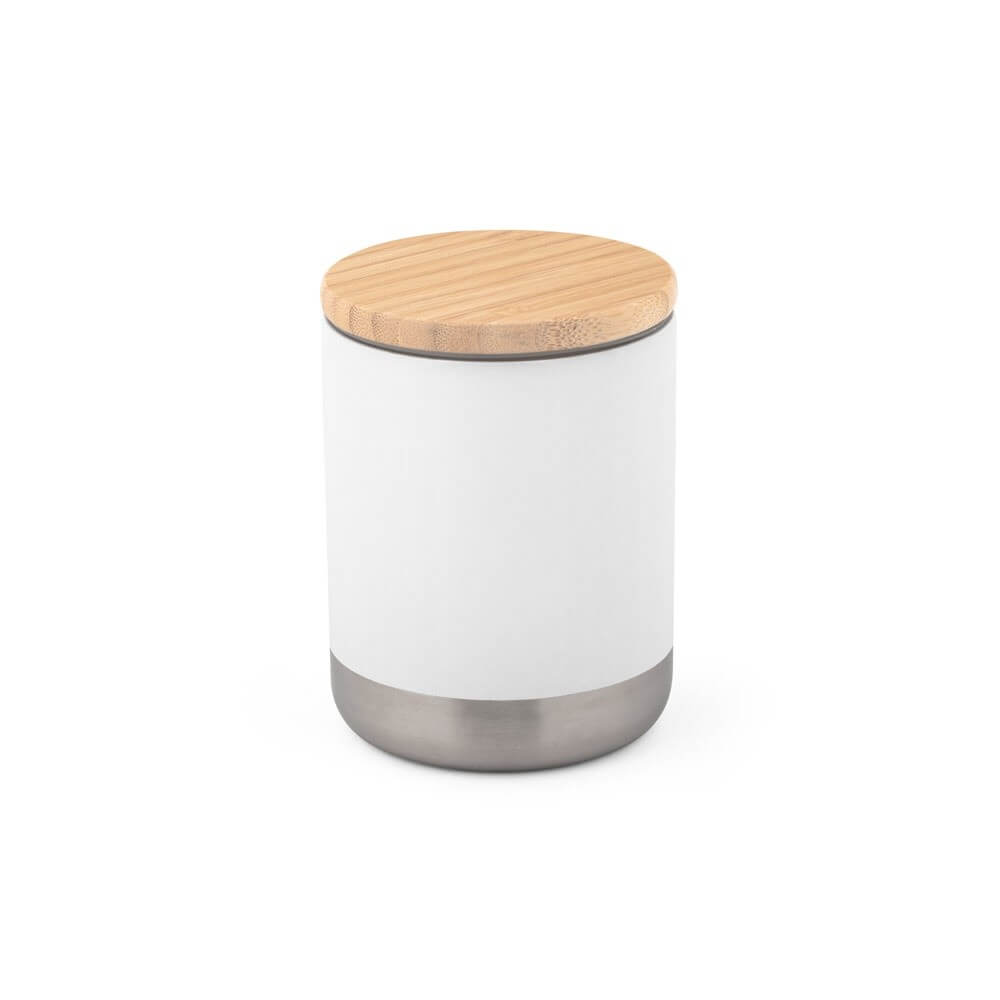 Dvouvrstvá vakuová nádoba z nerezavějící oceli s bambusovým víkem a těsnícím silikonovým kroužkem pro extra ochranu. Šálek má kapacitu až 370 ml a udrží nápoje teplé 5.5 hodiny a studené 24 hodin. Má také práškový povrch, který mu dodává větší trvanlivost a pevnost. Dodáváno v krabičce z kartonu.ø80 x 106 mm