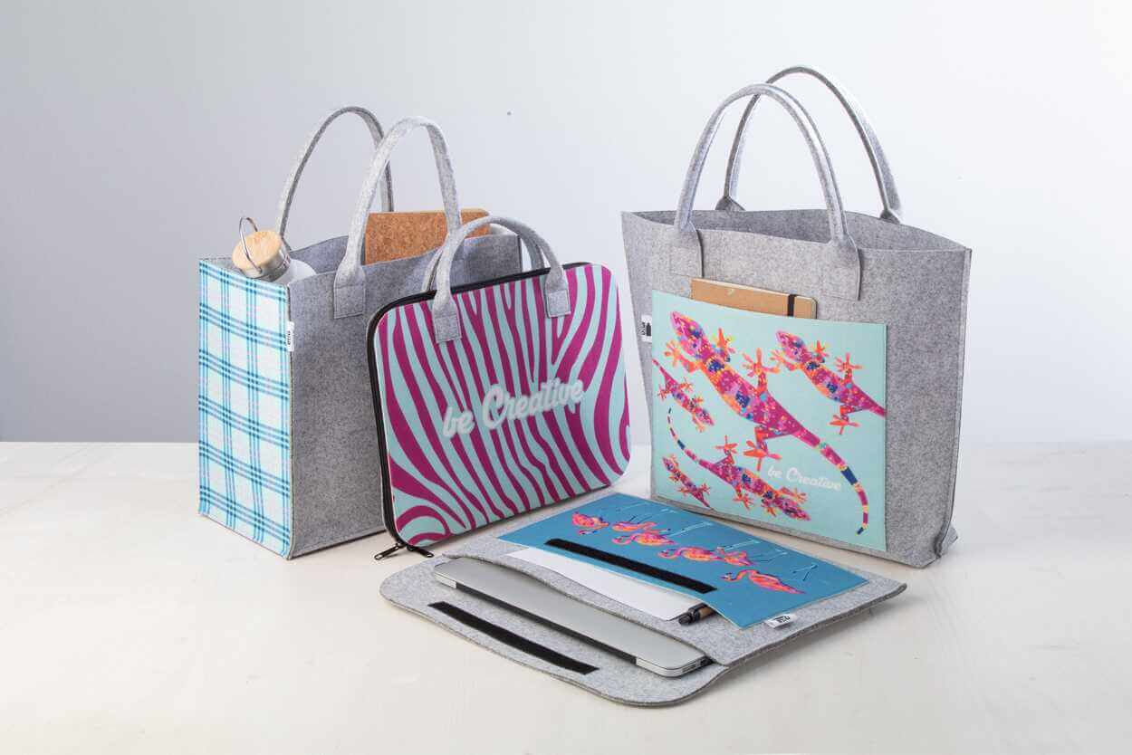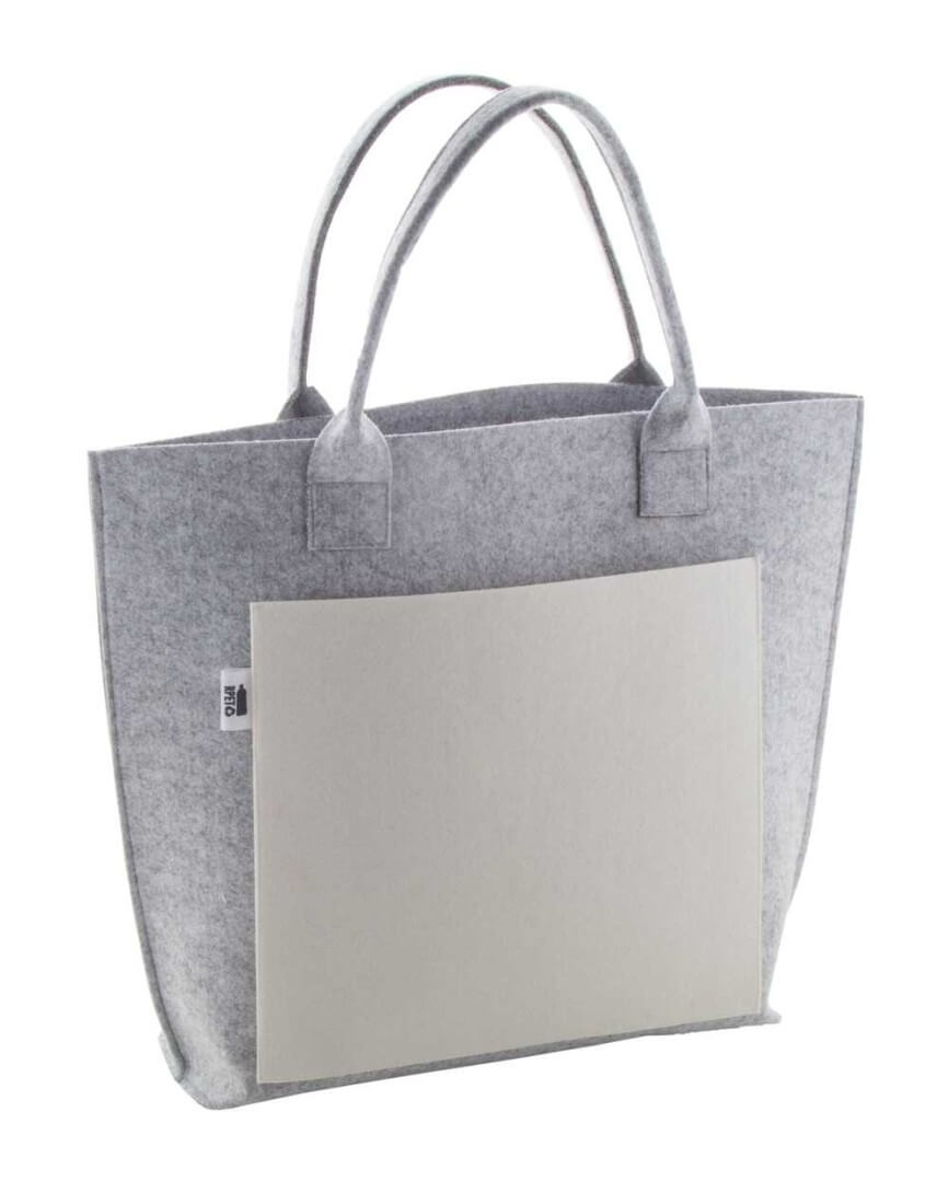 Na zákazku vyrobená nákupná taška z RPET filcu s celofarebne potlačeným predným vreckom. S krátkymi držadlami, spodným klinom a výrazným štítkom RPET. Cena vrátane sublimačnej tlače, nezahŕňa tlačovú prípravu. Min. mn.: 50 ks.