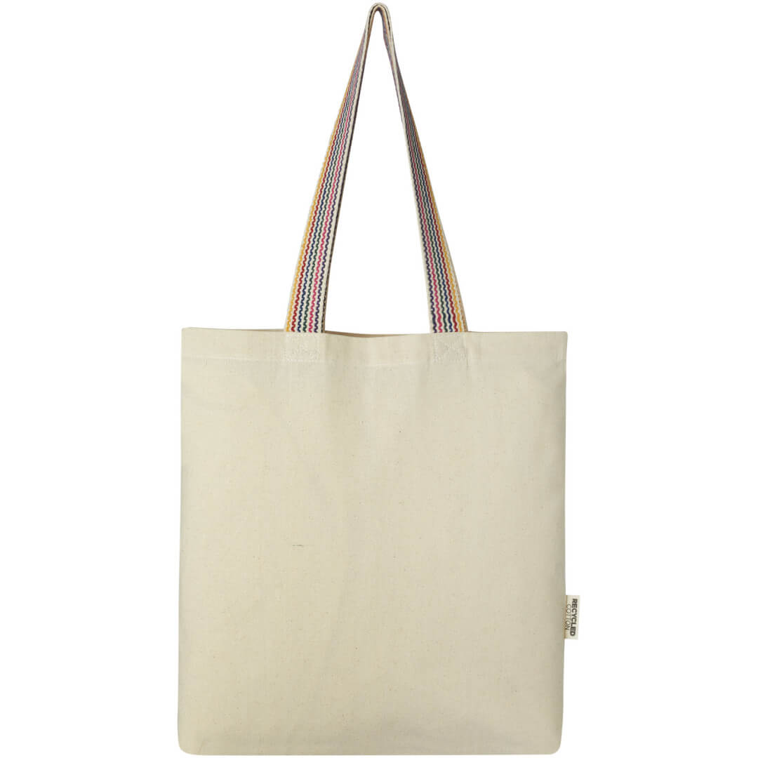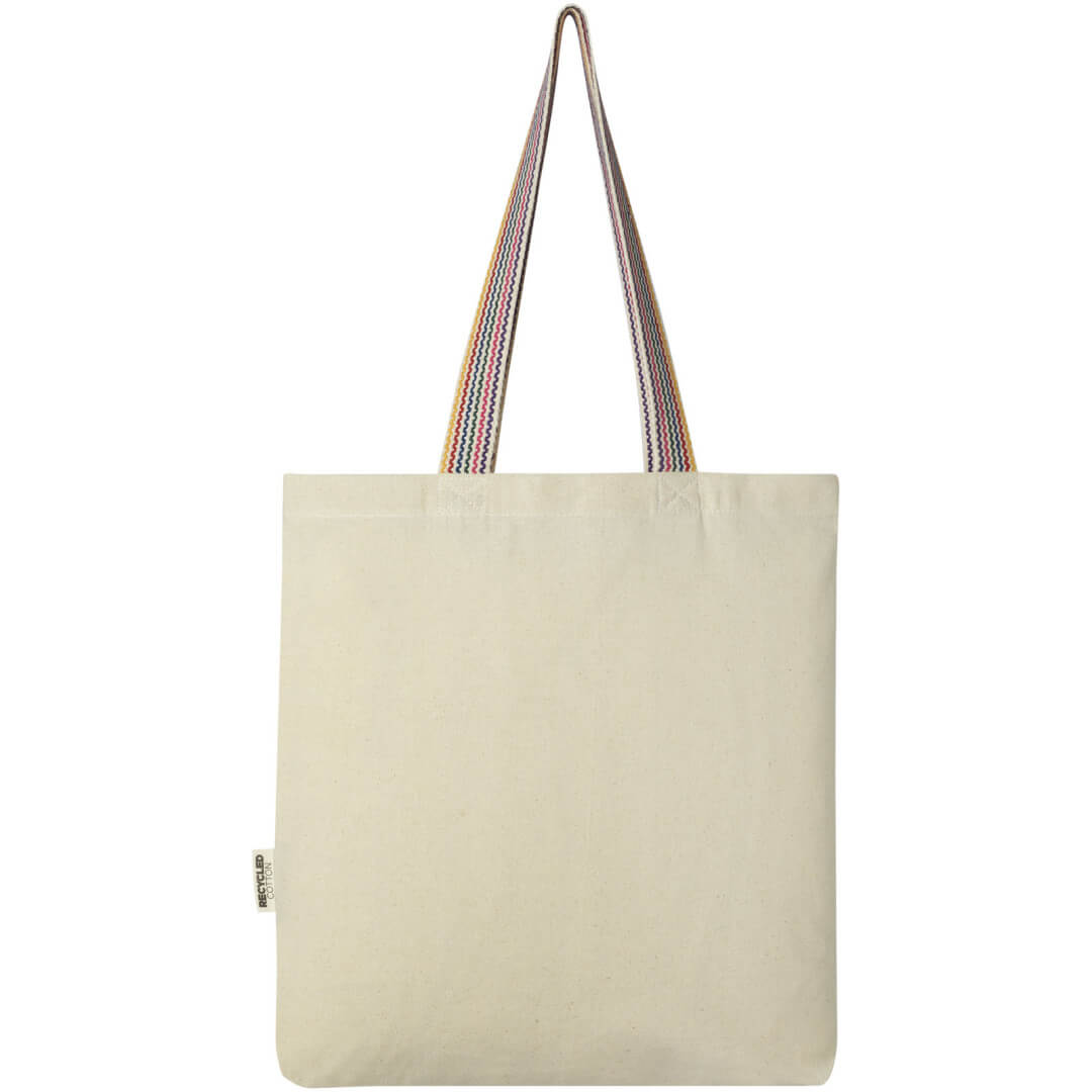 Nákupní taška Rainbow s gramáží 180 g/m² je vylepšením běžné bavlněné tašky. Tato taška na potraviny je vyrobena z recyklované bavlny a má 25 cm dlouhá ucha z duhového popruhu a 3,5 cm dno pro větší úložný prostor.