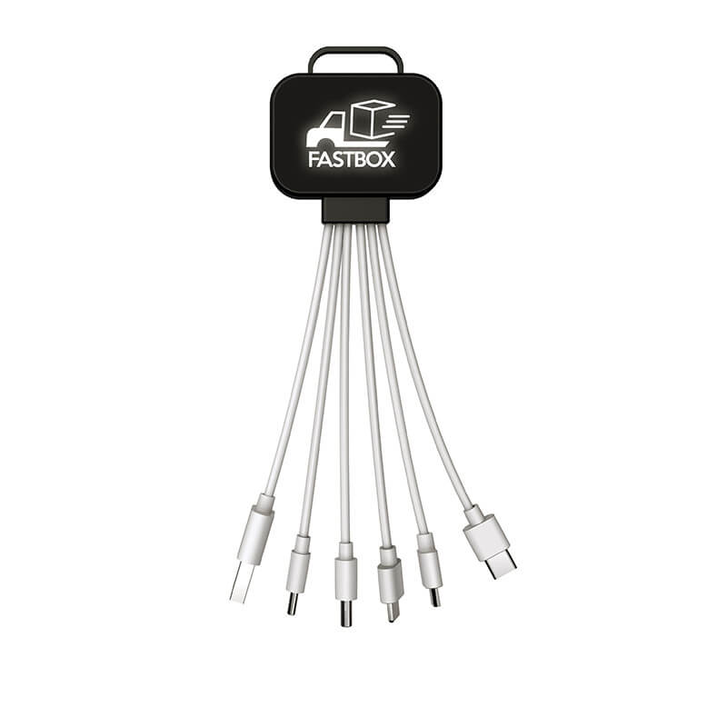 Konec dlouhému hledání správných kabelů pro nabití mobilního zařízení. Teď si vystačíte s jedním napájecím USB kabelem 5v1 s LED Light-Up logem. V napájecím kabelu jsou k dispozici konektory Lightning, Type-C, USB mini, USB micro a DC2.0. Vstupní kabel má konektor USB-A. S tímto praktickým zařízením máte po ruce všechny často používané konektory a navíc i skvěle vypadá. Spojovací část je možné opatřit libovolným barevným potiskem nebo svítícím LED logem podle vlastního přání.
