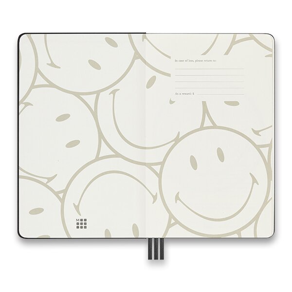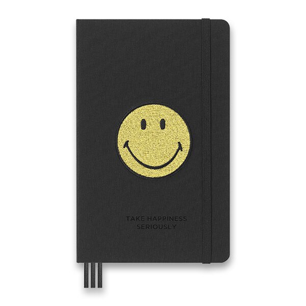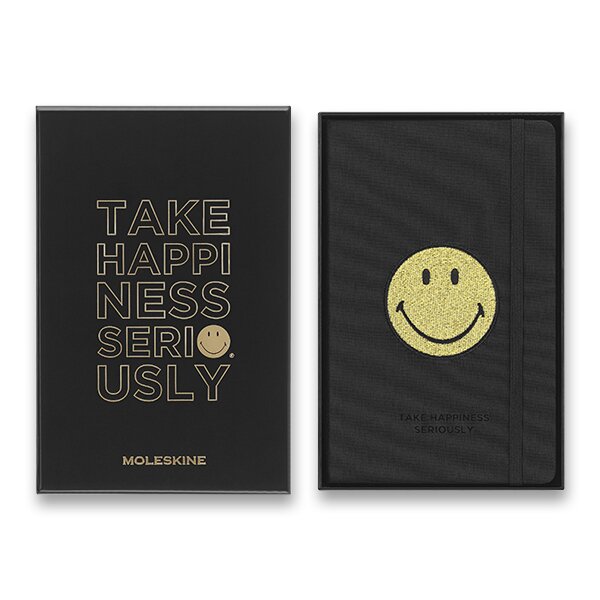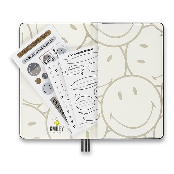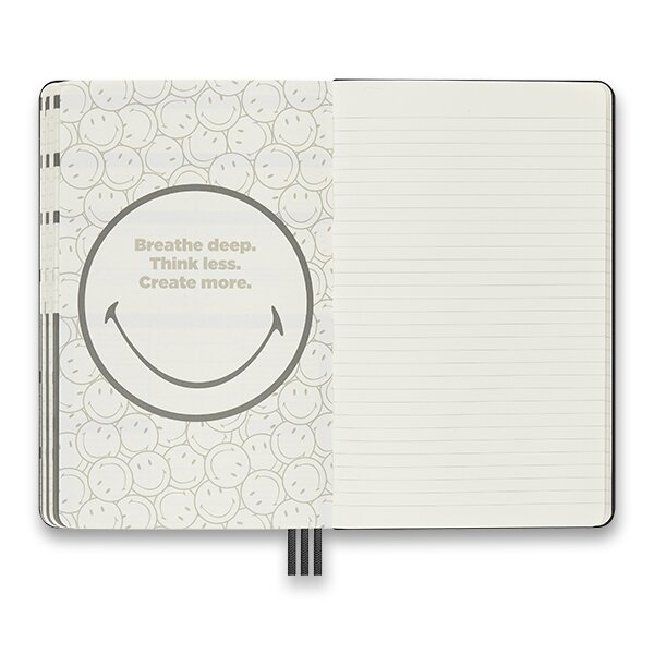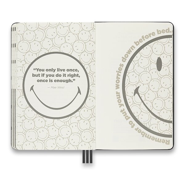 Sběratelská edice nedatovaného diáře Moleskine 2023 SMILEY z limitované edice SMILEY má pevnou, v zádech šitou vazbu v kartonových deskách. Vnitřní část je tematicky zdobená prvky SMILEY. Diář má pružnou gumičku proti samovolnému otevírání. Obsahuje praktickou vnitřní kapsu na vizitky a dokumenty, textilní záložku a leták s historií MOLESKINE.