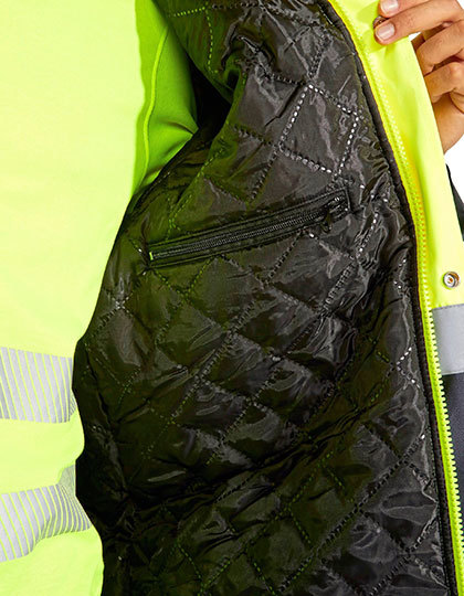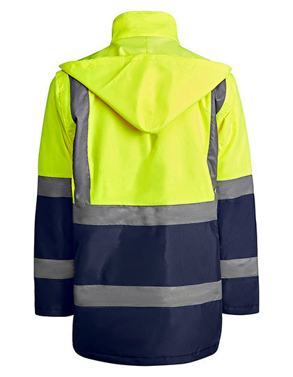 Kombinovaná, prošívaná reflexní parka | Nepromokavá tkanina s tepelně lepenými švy | Skládací kapuce s nastavitelnou stahovací šňůrkou | Dva vodorovné reflexní proužky na trupu a rukávech a svislé reflexní proužky na ramenou | Náprsní kapsa s klopou a zapínáním na suchý zip a držákem na jmenovku | Dvě přední kapsy s klopou | Vnitřní kapsa na zip | Skryté manžety na pažích v žebrovaném úpletu 1x1 | Středová léga s kovovými knoflíky na zapínání a středový zip se dvěma jezdci | Další kapsa na sítotisk | Certifikace CE podle norem: EN ISO 13688:2013 a EN ISO 20471:2013/A1:2016, Třída I: 55221 – 55223 – 52221 – 23221, II: 23221, Třída II: 221