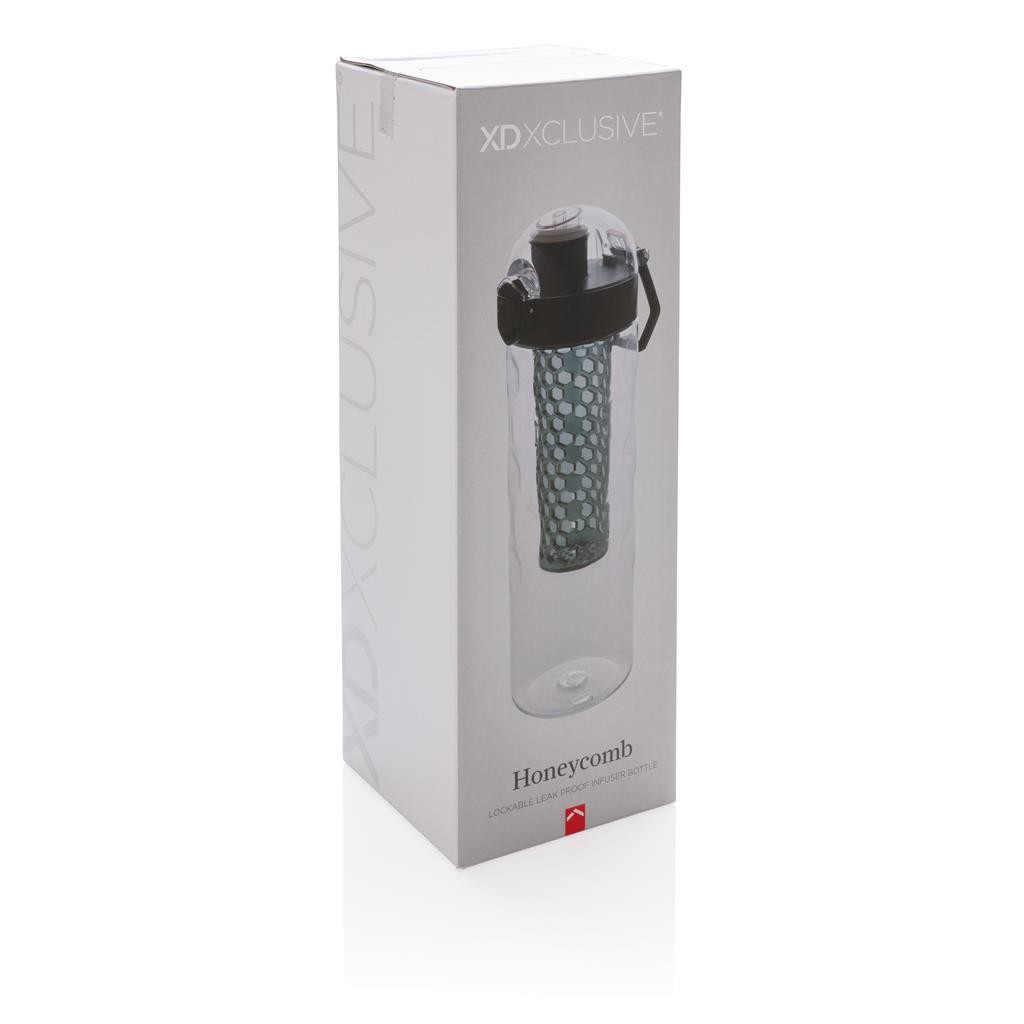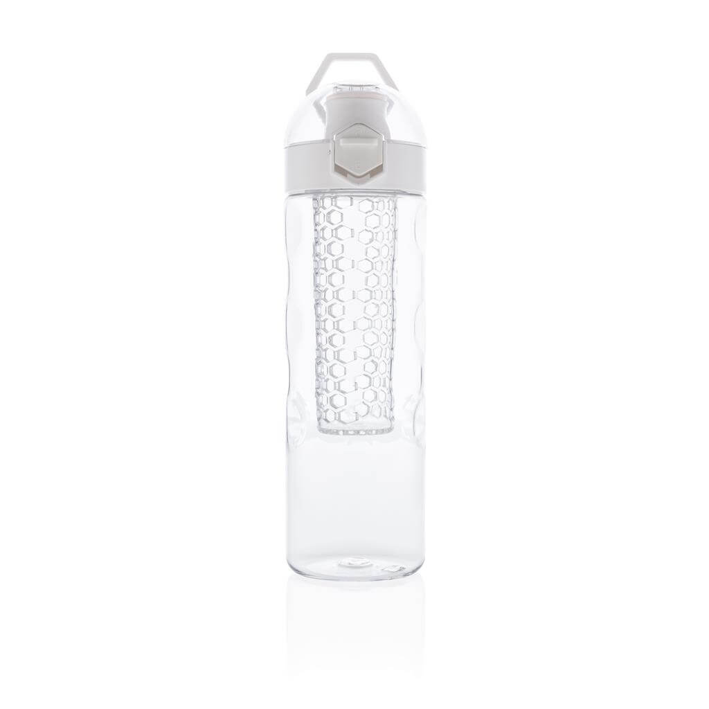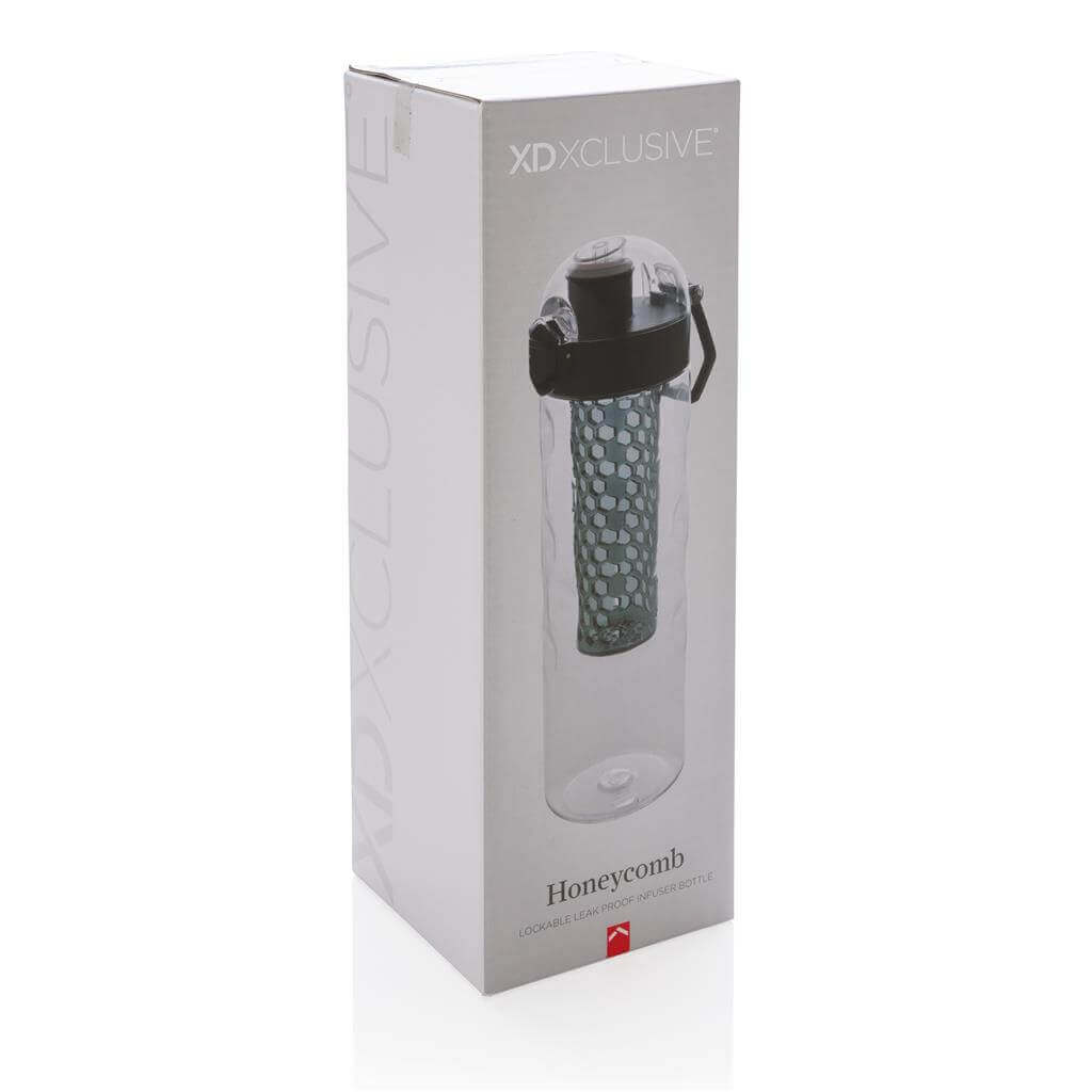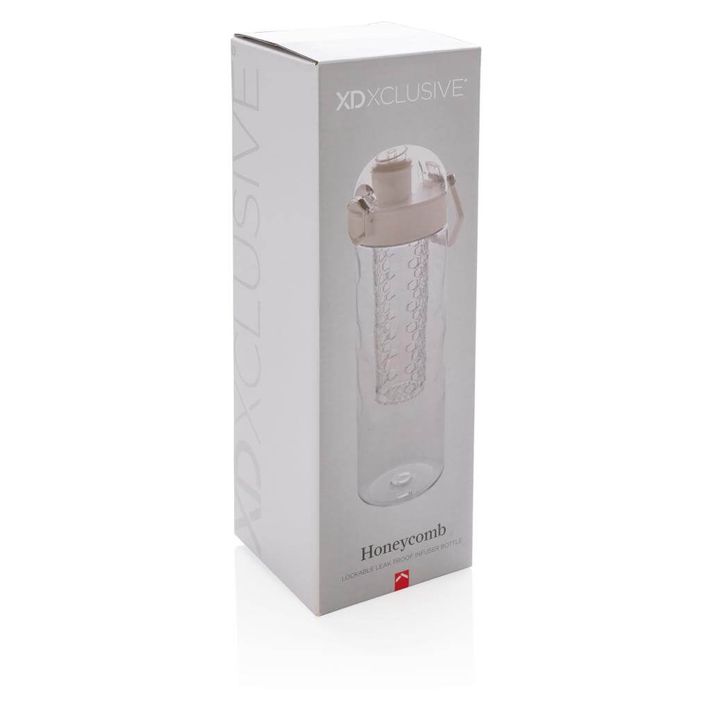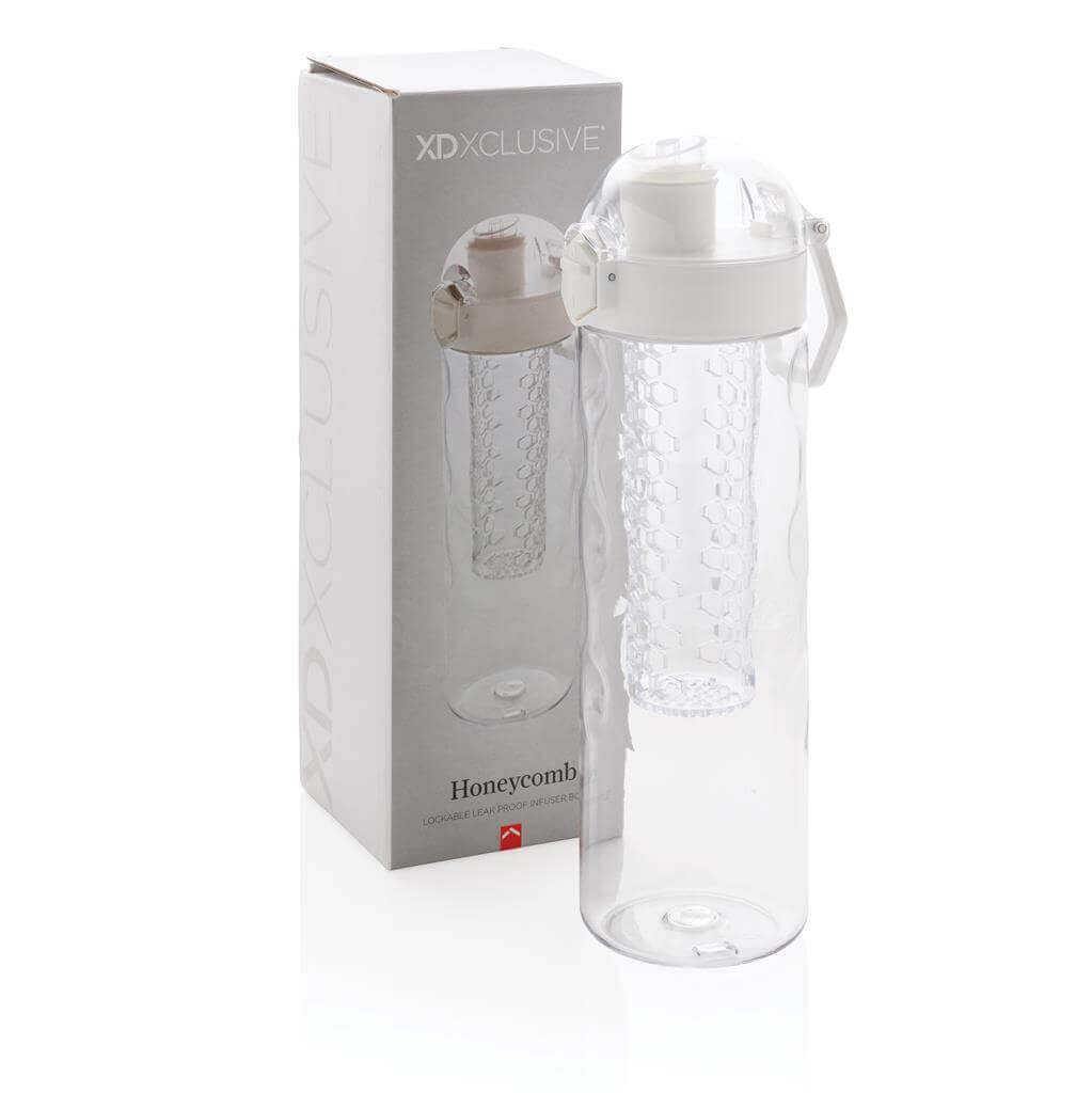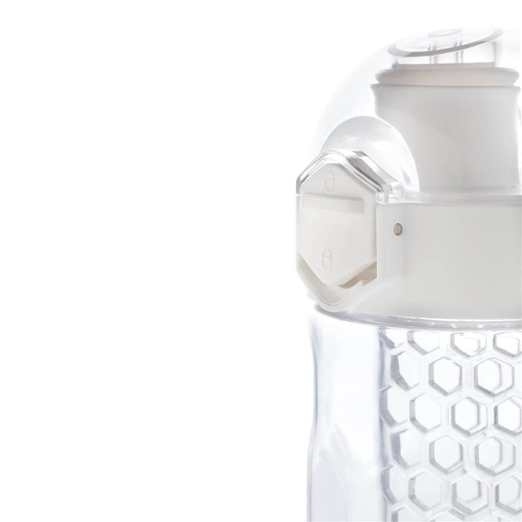 Praktická láhev z odolného moderního tritanu s designovými prvky medových pláství pro pohodlné pití jednou rukou. Otevírání víčka pomocí uzamykatelného mechanizmu na stlačení, které chrání proti náhodnému vylití. Včetně infuseru pro zdravé osvěžení nápojů ovocem a plastového poutka pro nošení. BPA free, neabsorbuje pachy. Objem: 700ml. Ochranný vzor® PMS color 1: Black PMS color 1: White PMS color 1: 319