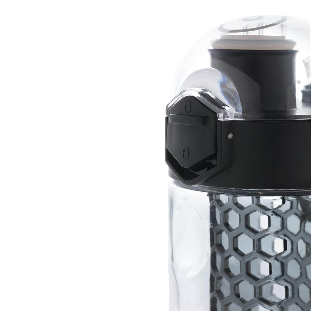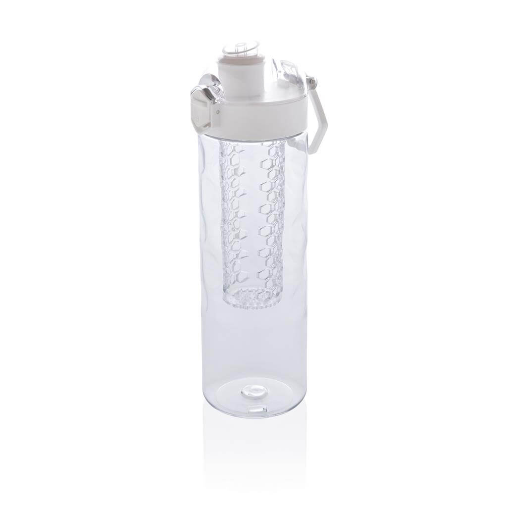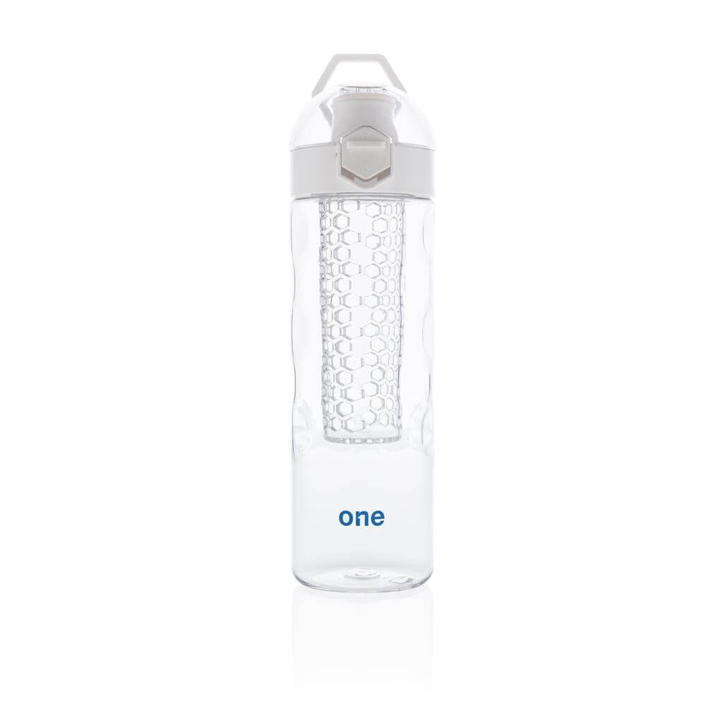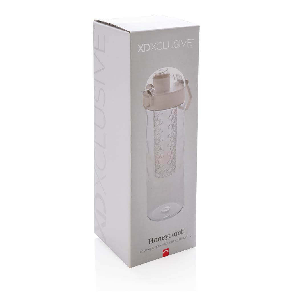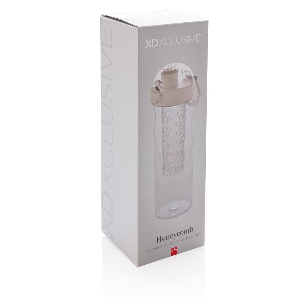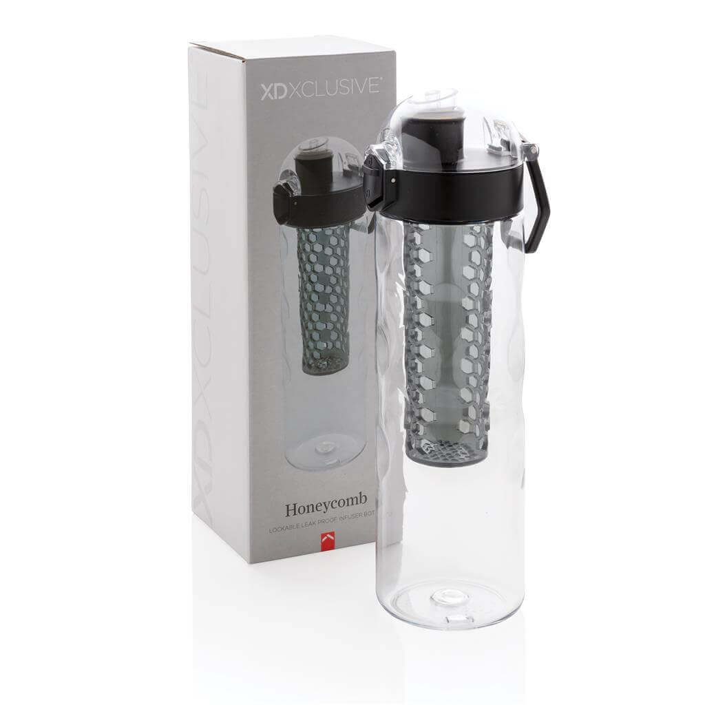 Praktická láhev z odolného moderního tritanu s designovými prvky medových pláství pro pohodlné pití jednou rukou. Otevírání víčka pomocí uzamykatelného mechanizmu na stlačení, které chrání proti náhodnému vylití. Včetně infuseru pro zdravé osvěžení nápojů ovocem a plastového poutka pro nošení. BPA free, neabsorbuje pachy. Objem: 700ml. Ochranný vzor® PMS color 1: Black PMS color 1: White PMS color 1: 319