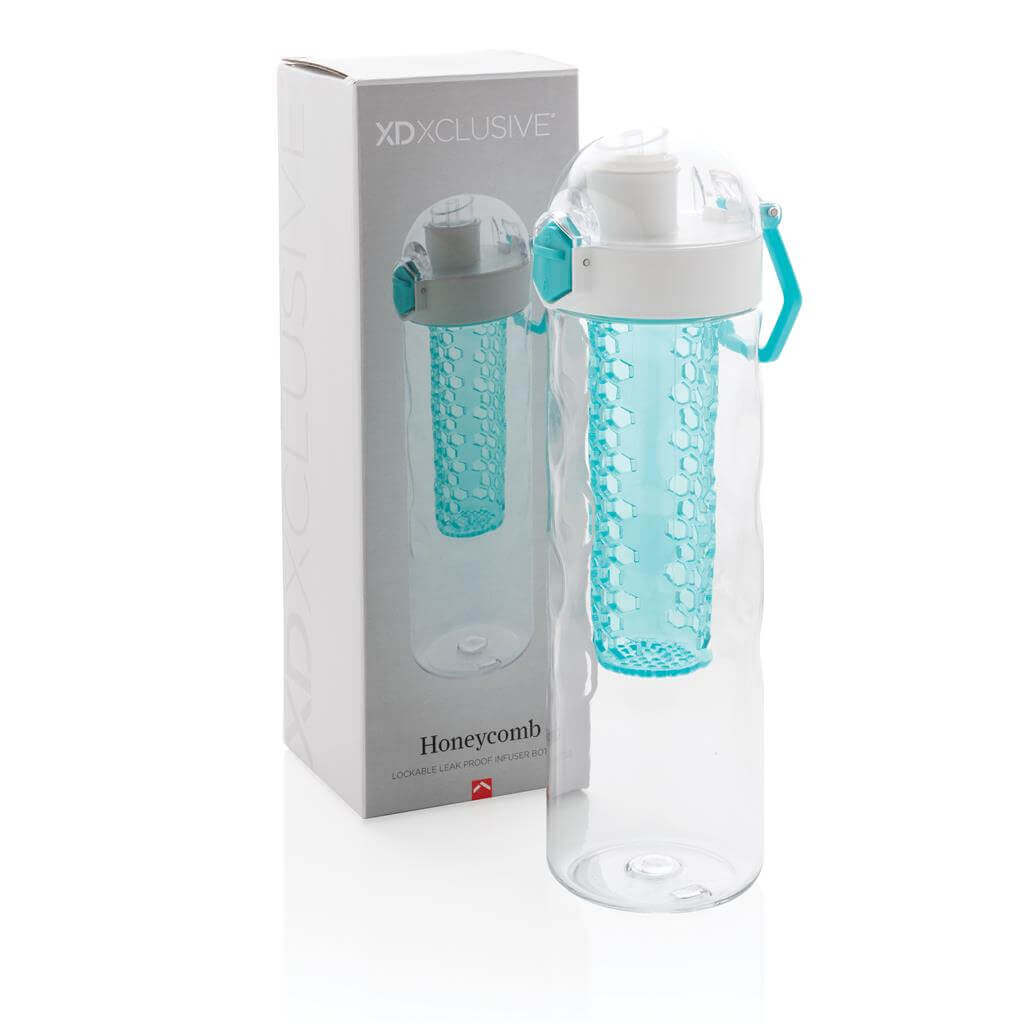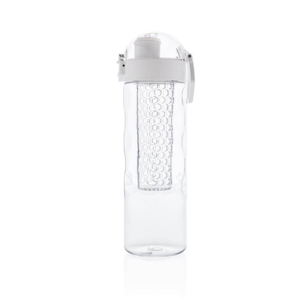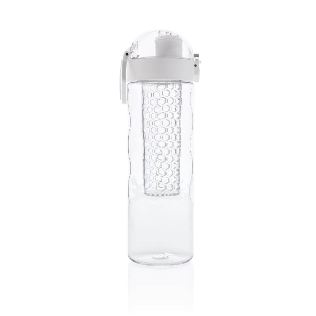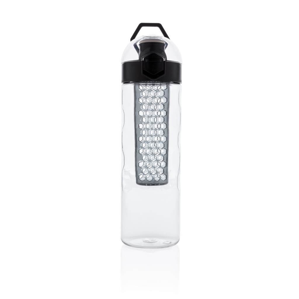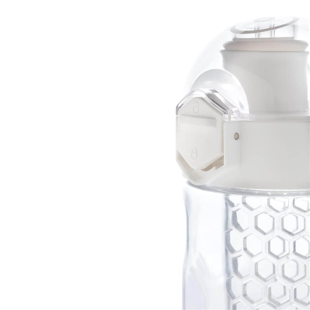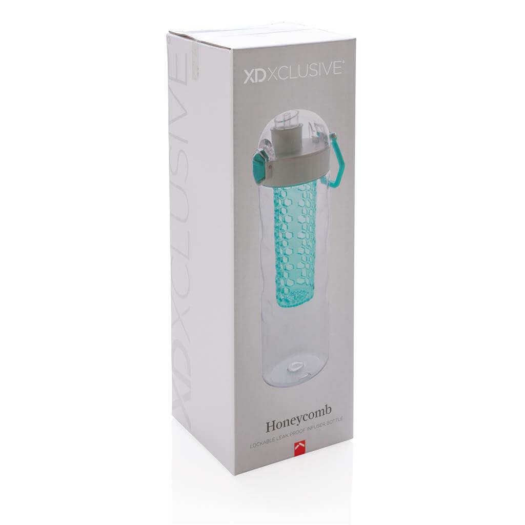 Praktická láhev z odolného moderního tritanu s designovými prvky medových pláství pro pohodlné pití jednou rukou. Otevírání víčka pomocí uzamykatelného mechanizmu na stlačení, které chrání proti náhodnému vylití. Včetně infuseru pro zdravé osvěžení nápojů ovocem a plastového poutka pro nošení. BPA free, neabsorbuje pachy. Objem: 700ml. Ochranný vzor® PMS color 1: Black PMS color 1: White PMS color 1: 319
