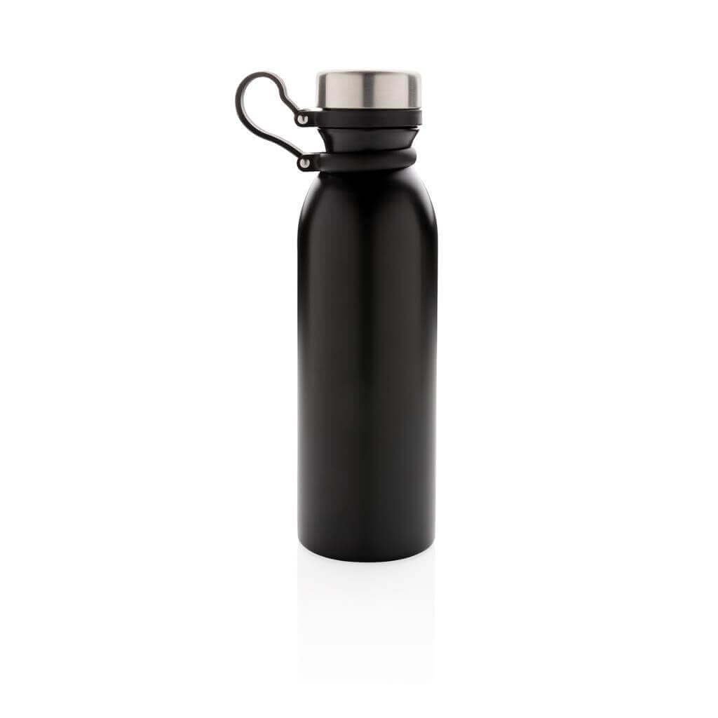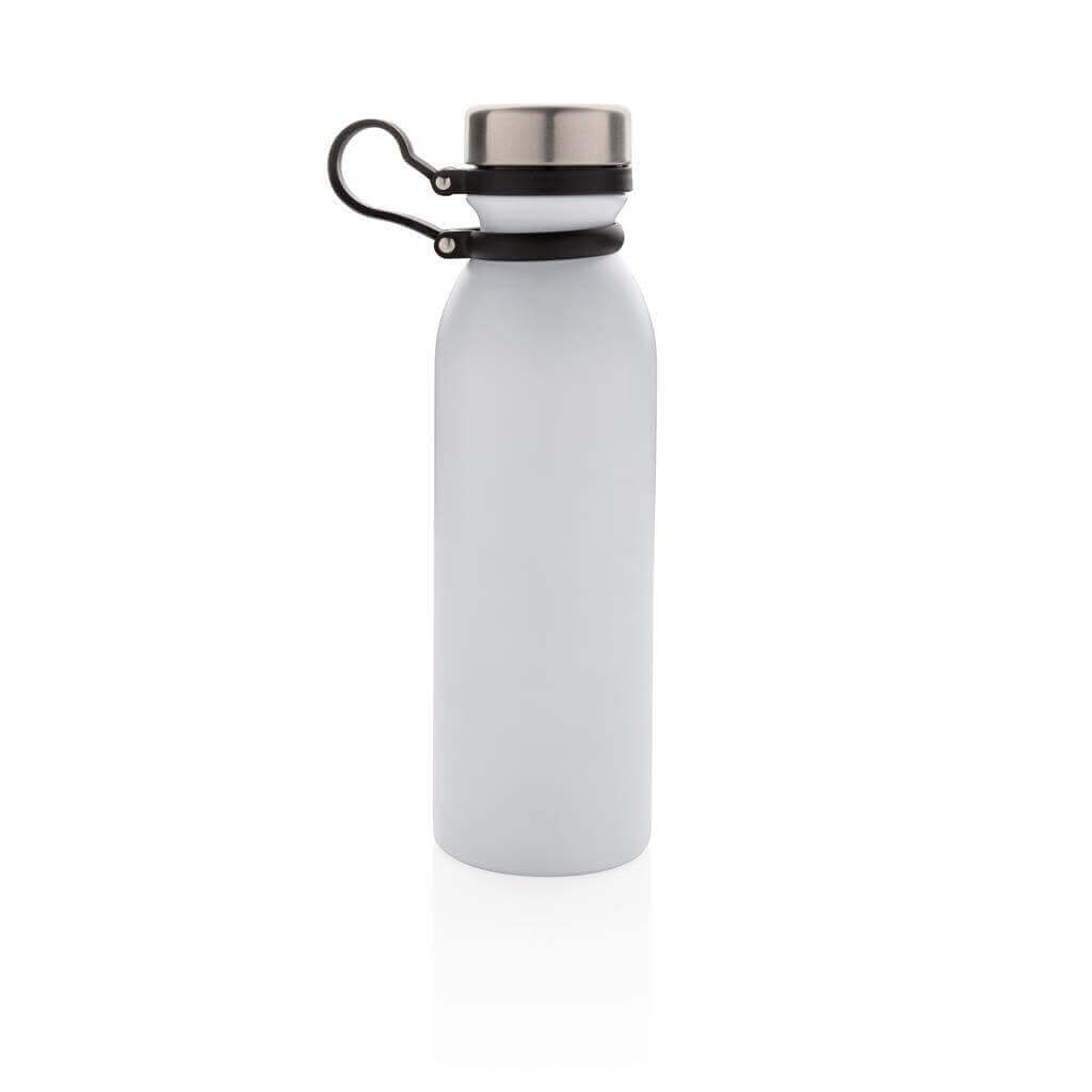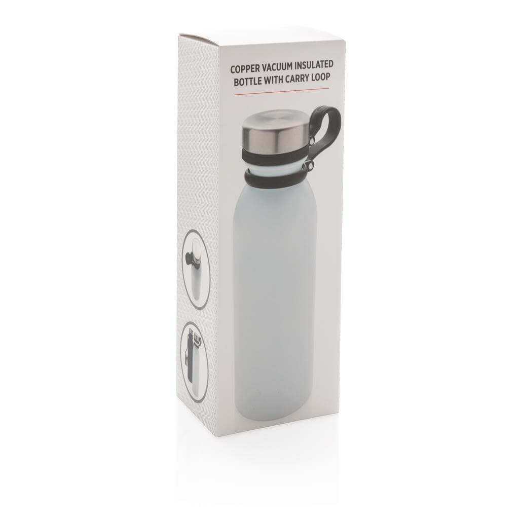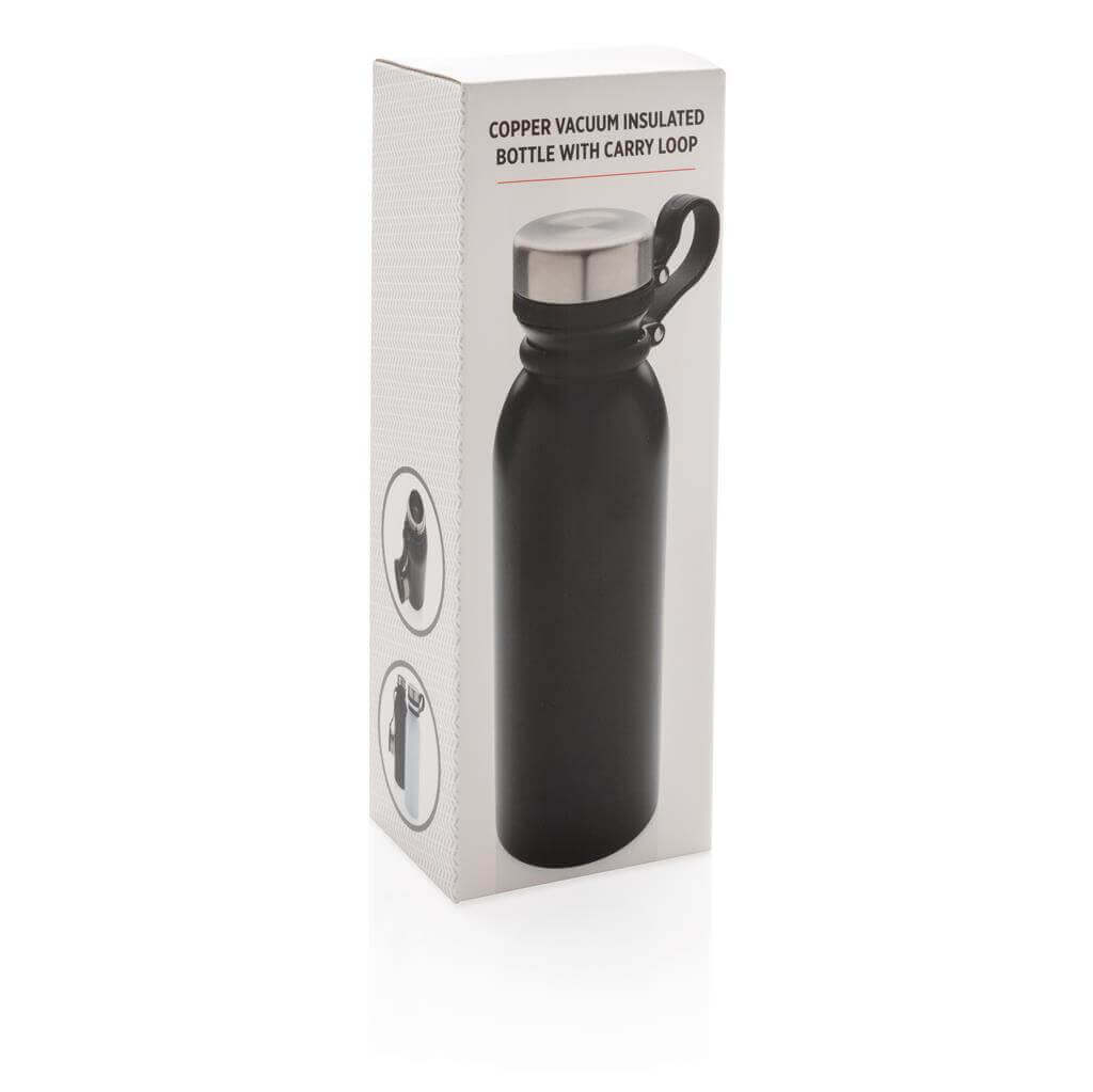 Nepropustná termo láhev s vakuovo měděnou izolací s černým silikonovým poutkem na nošení. Poutko je připevněno k víčku, čímž nehrozí jeho ztráta a není jej při pití třeba druhou rukou držet. Dvojstěnná vakuová konstrukce s měděnou izolací udrží nápoje až 8 horké a 24h studené. Konstrukce zabraňuje kondenzaci na vnější straně lahve. Objem: 600ml. PMS color 1: Black PMS color 1: White
