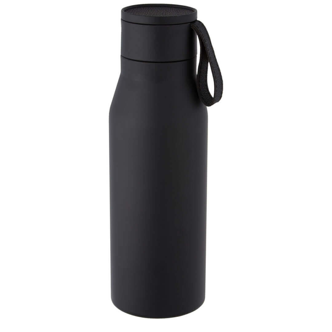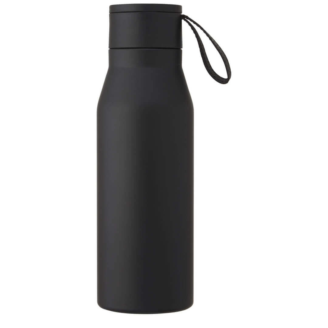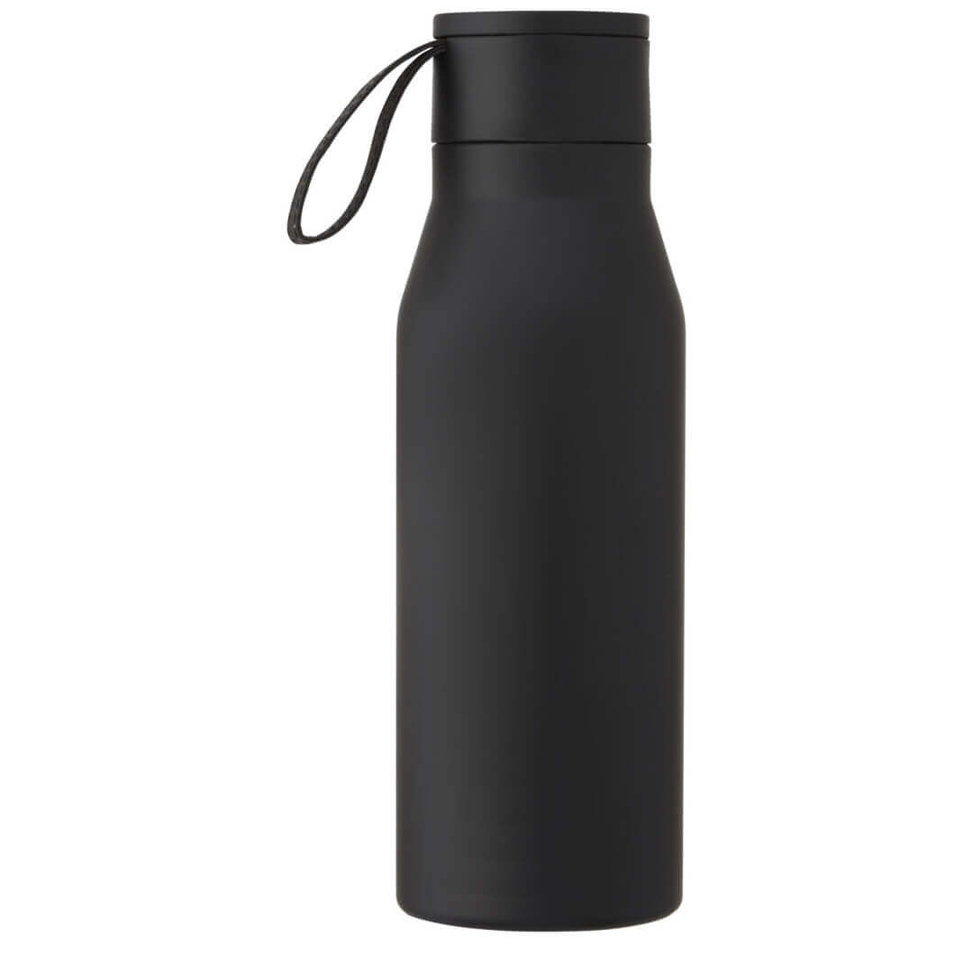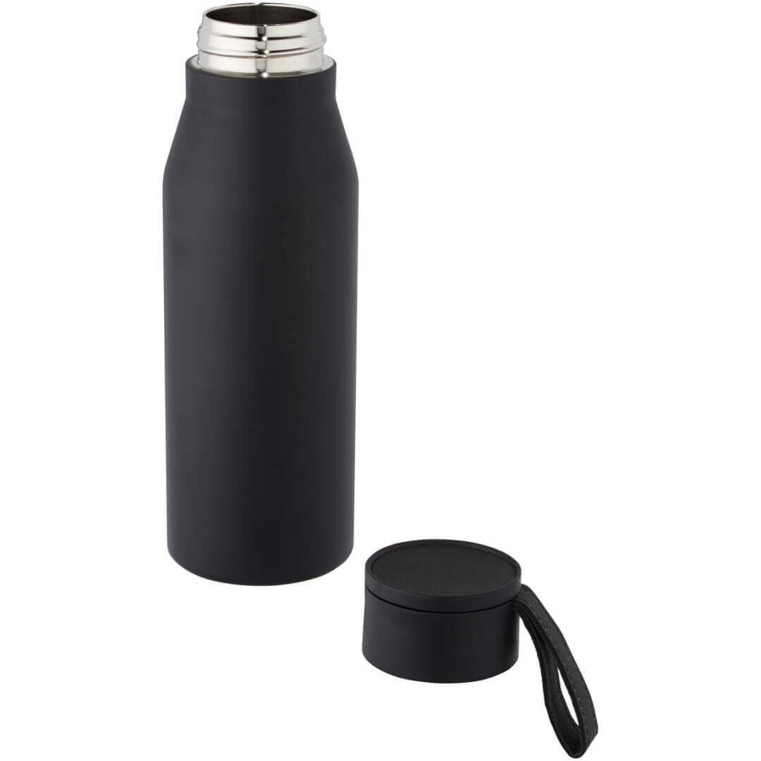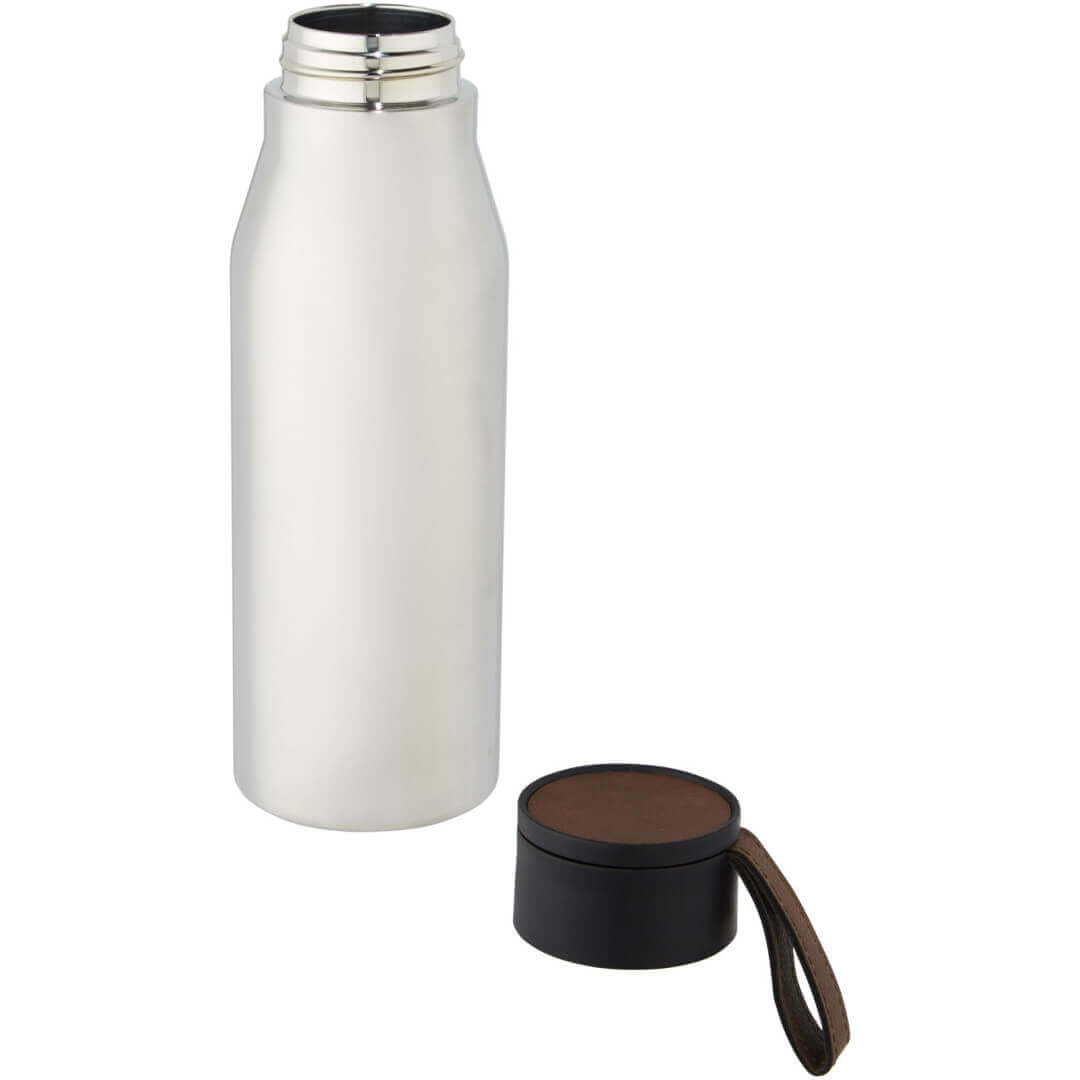 Nerezová láhev s měděnou vakuovou izolací v klasickém, elegantním designu. Pásek a detaily na víčku jsou z PU kůže. Skvěle se hodí pro laserové gravírování, při němž se vytvoří stříbrné logo a tím i nádherný vizuální efekt. Dvouplášťová nerezová ocel 18/8 s měděnou vakuovou izolací udrží nápoje horké nebo studené po dobu několika hodin. Testováno a schváleno podle německé legislativy pro bezpečnost potravin (LFGB), testováno na obsah ftalátů podle předpisů REACH. Objem je 500 ml. Dodává se v dárkové krabičce z recyklované lepenky.